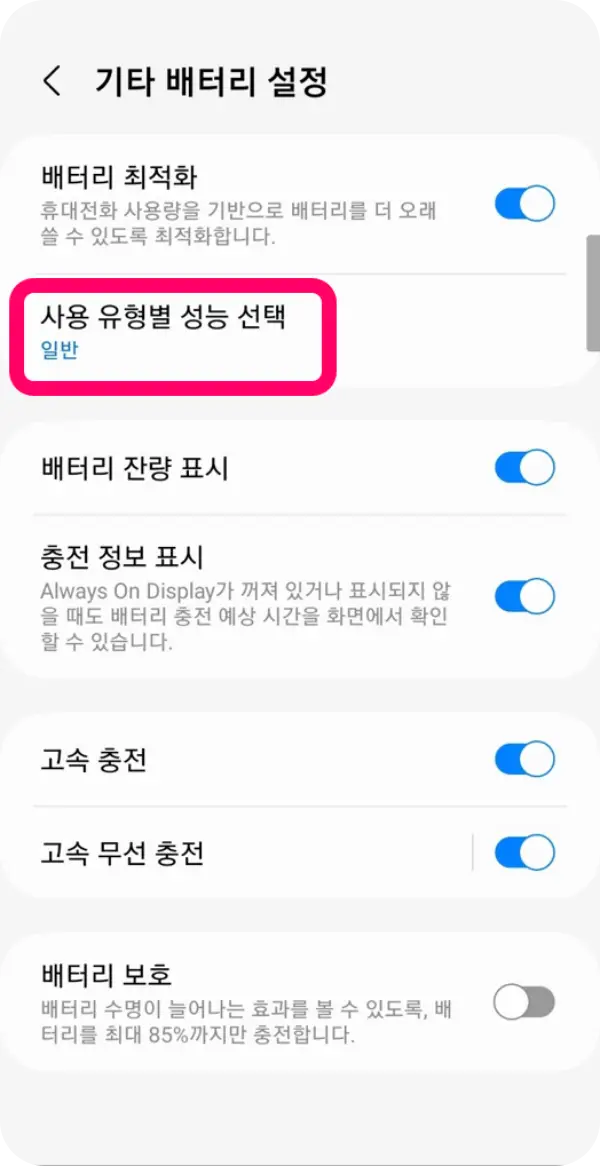 1) 이전 [기타 배터리 설정] 하단 [배터리 보호] 활성화