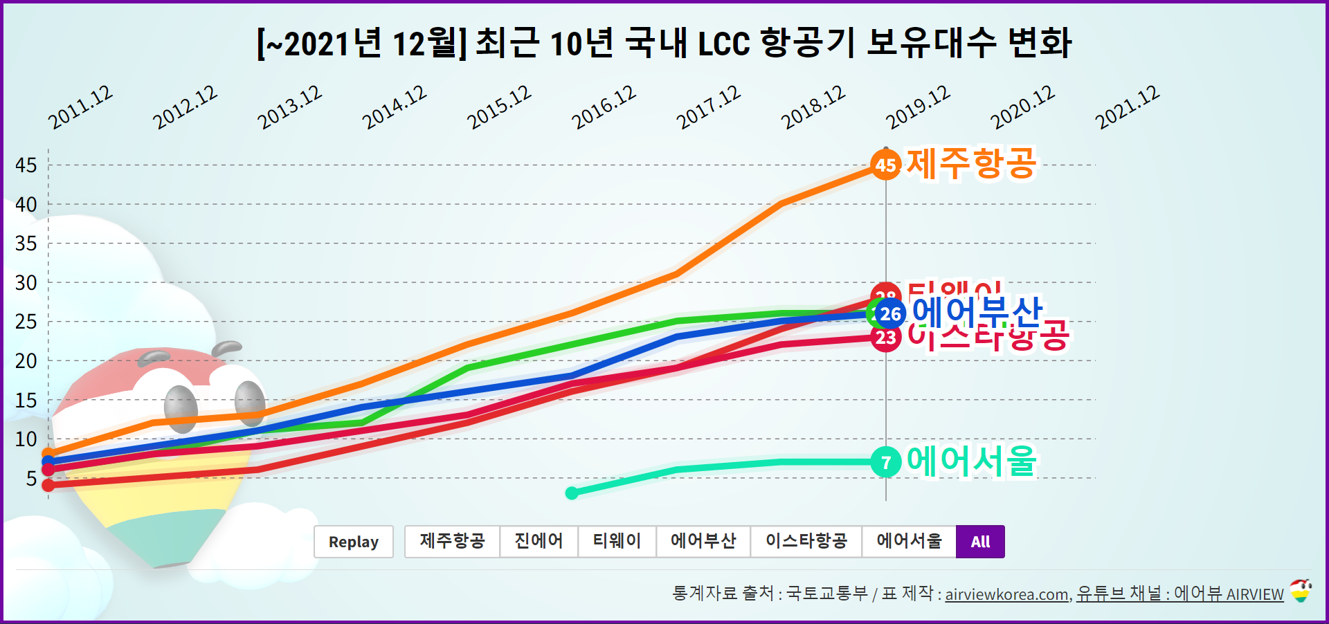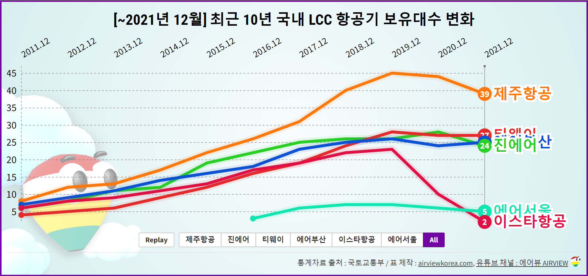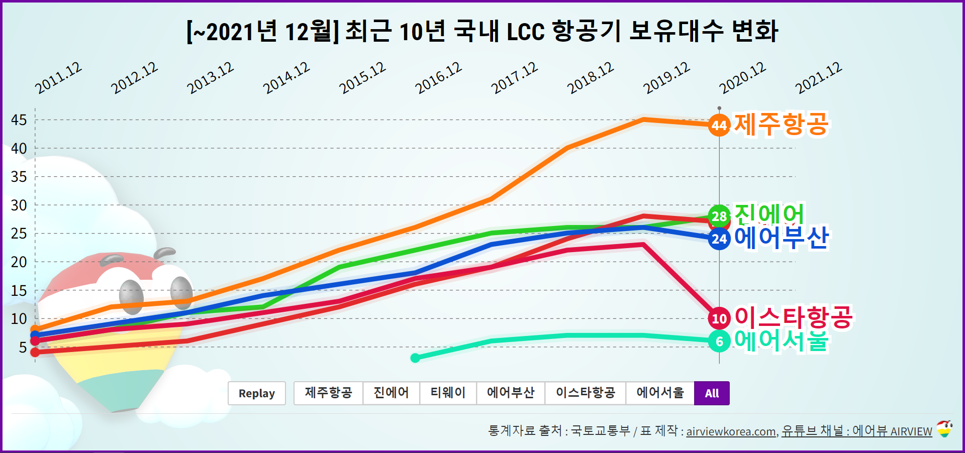 2021년 12월 기준, 우리나라 저가항공사(LCC) 6개 기준 비행기 보유대수 변화 현황에 대해 알려드릴게요.