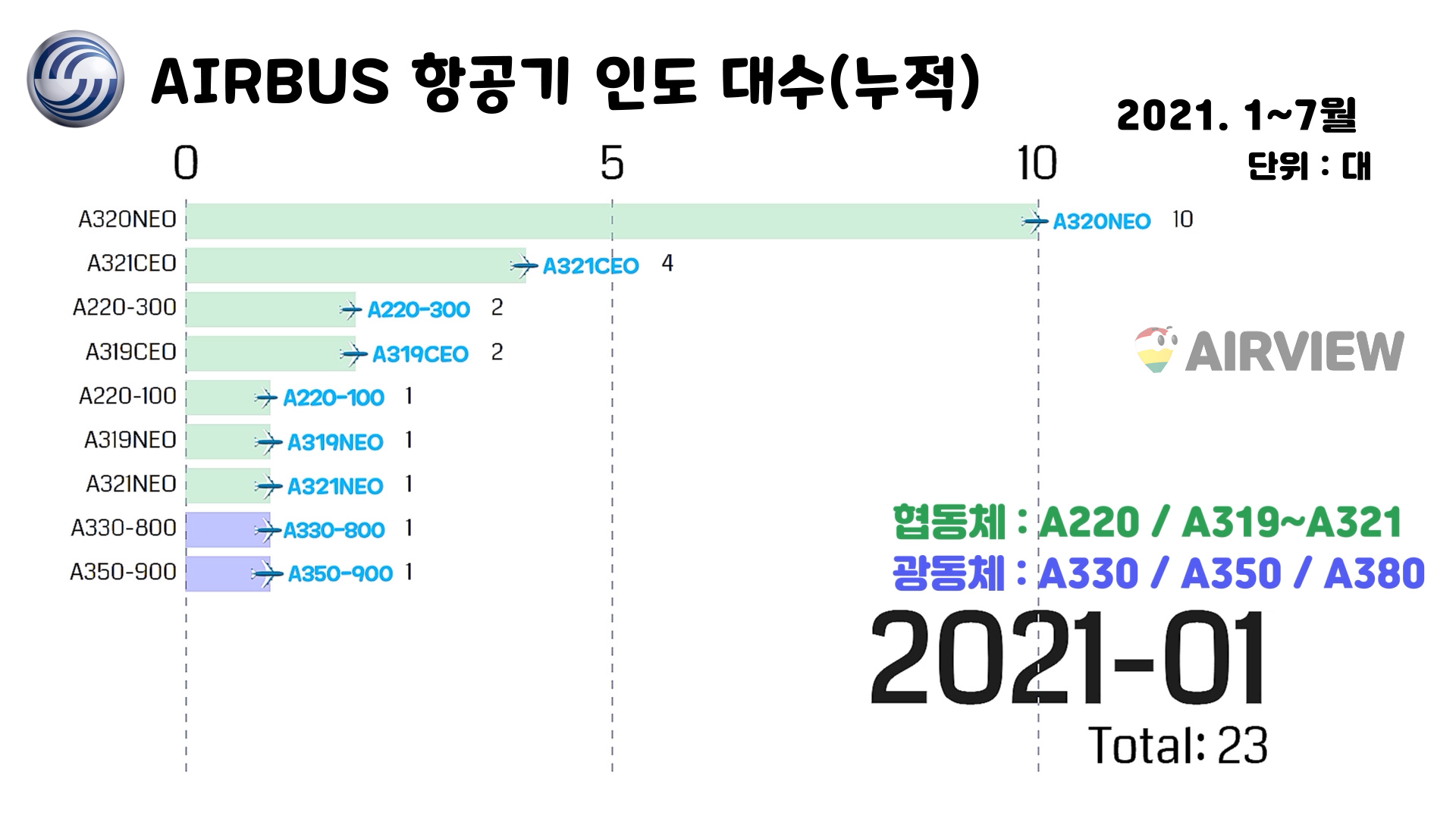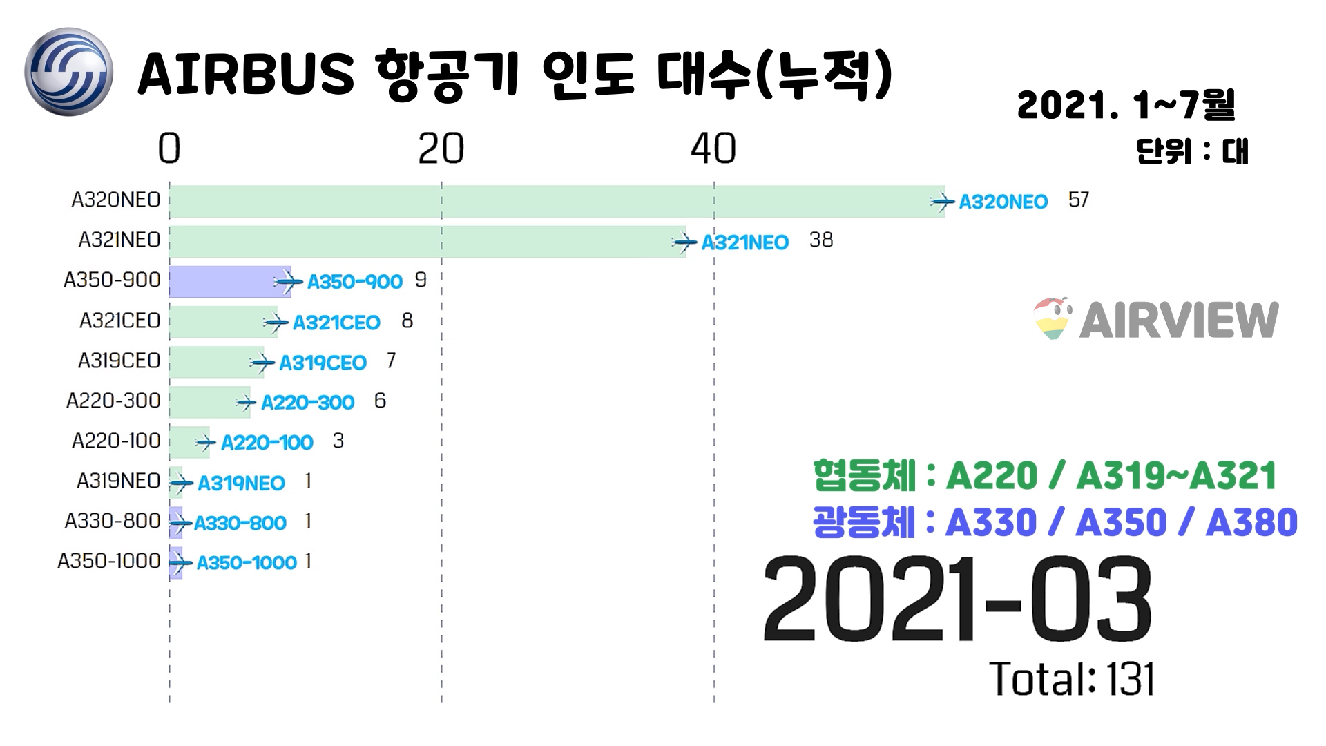 [2021년 1~7월] 에어버스 AIRBUS 상업용 비행기 인도(판매실적) 종류/세부기종/대수
