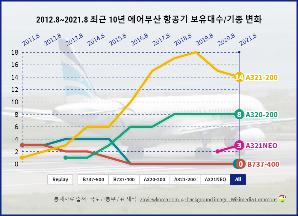 [~2021년 8월] 최근 10년 에어부산 비행기는 몇대? 종류 보유기종/보유대수 변화 (항공기 에어버스 A320/A321)