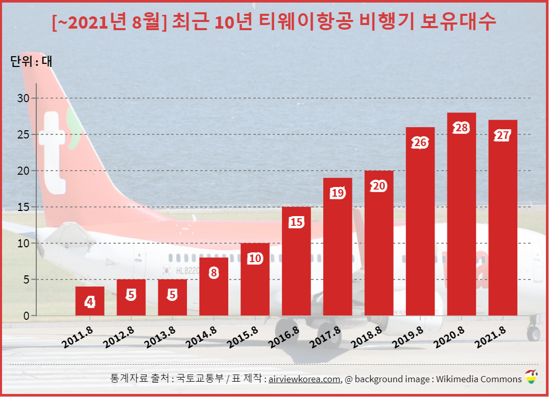 [~2021년 8월] 최근 10년 티웨이항공 비행기는 몇대? 종류 보유기종/보유대수 변화 (항공기 보잉 B737-800)