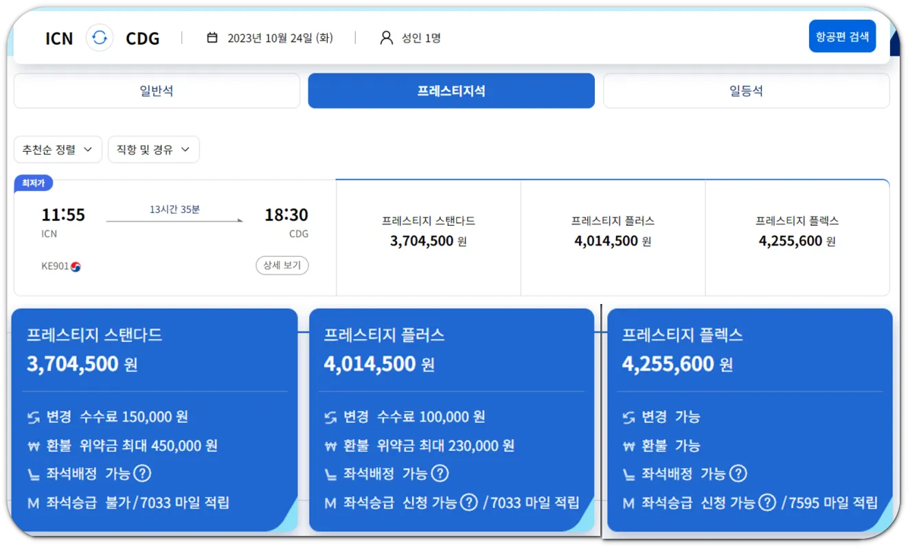 대한항공의 인천-파리 노선 비즈니스(프레스티지) 좌석 예약을 예시로 보면, 동일한 비즈니스석이지만 등급이 구분되어 있다