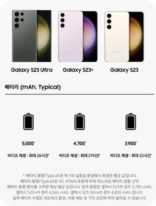 배터리 용량 자체는 S23 울트라가 5000mAh로 가장 크지만, 액정이 큰 만큼 더 많은 전력을 소비하기 때문에 실질적으로 가장 배터리 시간이 긴 것은 S23 플러스 모델입니다.