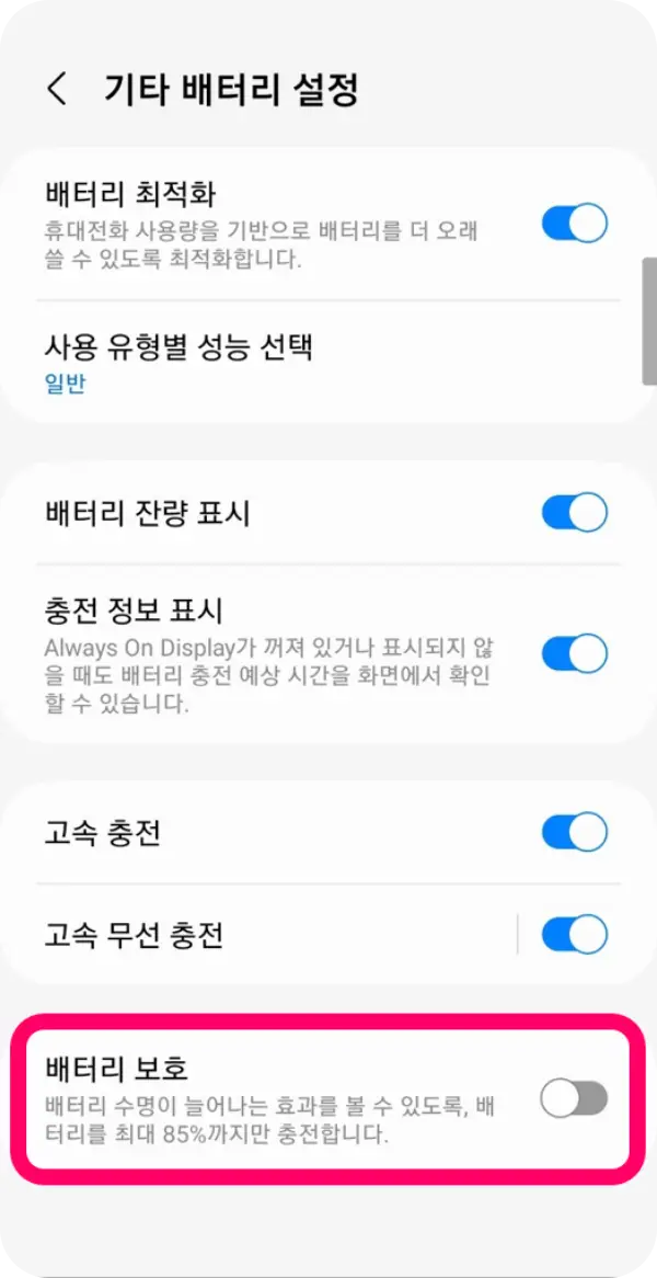 1) 이전 [기타 배터리 설정] 하단 [배터리 보호] 활성화