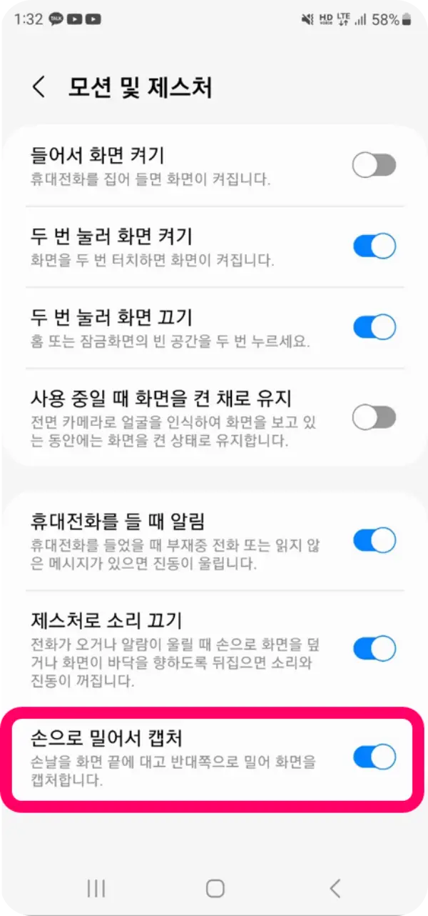 3. 손으로 밀어서 캡처 활성화