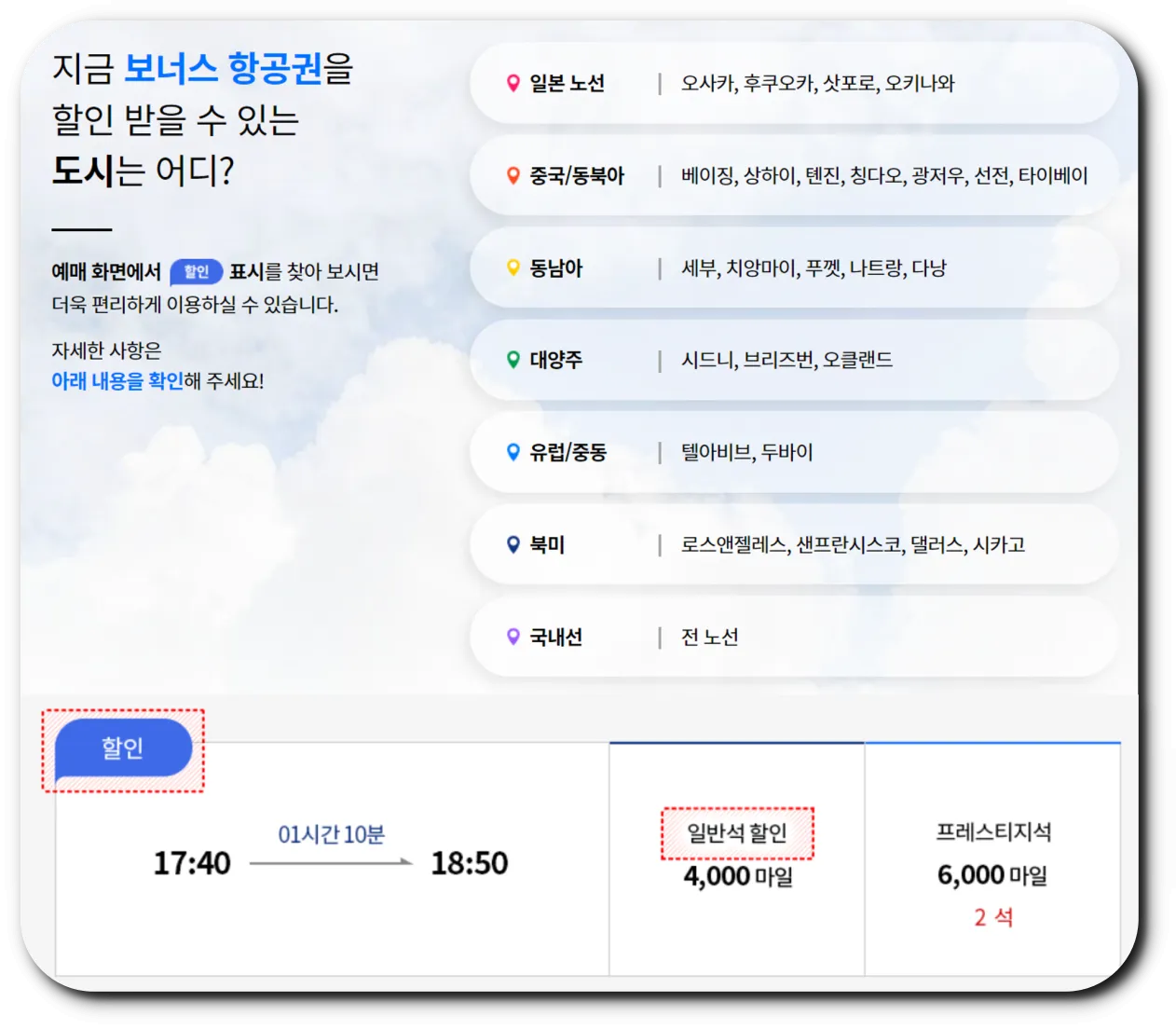 | 노선 | 좌석 등급 | 할인 마일리지 |