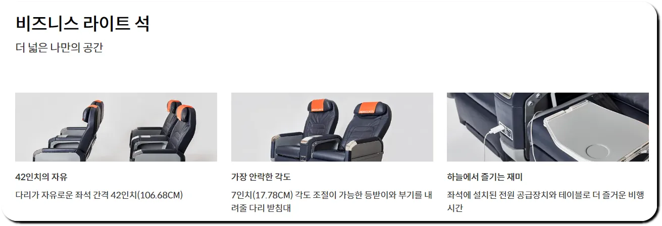 | 제주항공 | 비즈니스 라이트 | 42인치의 좌석 간격 다리 받침대 |
