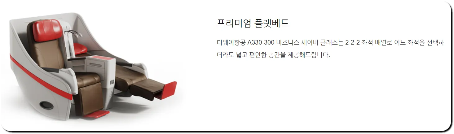 | 티웨이항공 | 비즈니스 세이버 | A330 기종 한정 59인치의 좌석 간격 165도 기울임 가능 |