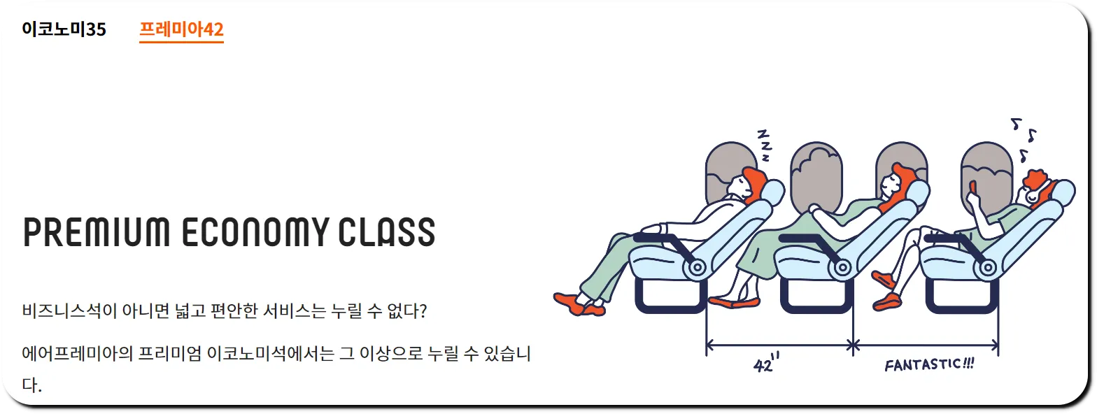 | 에어프레미아 | PREMIA 42 | 42인치의 좌석 간격 다리 받침대 |