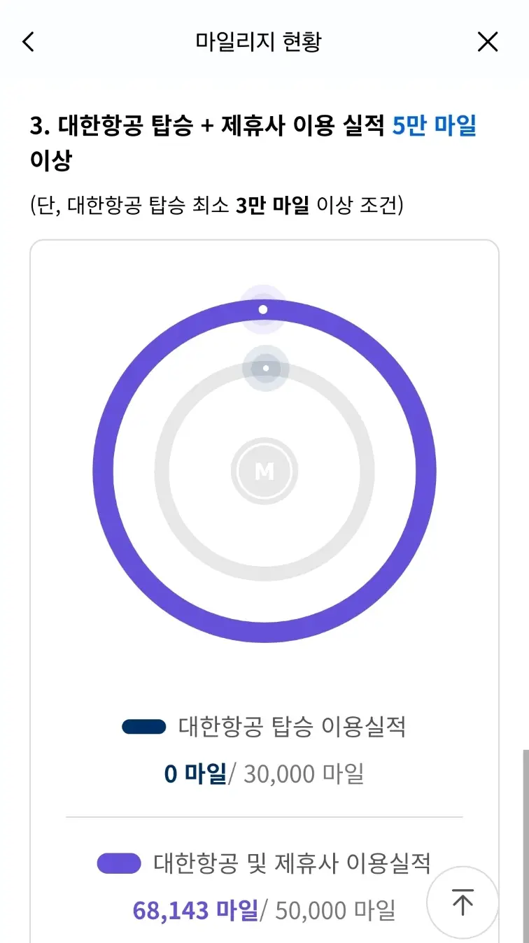 제휴사 마일리지를 아무리 많이 모아도 대한항공을 직접 탑승하지 않으면 불가능하다