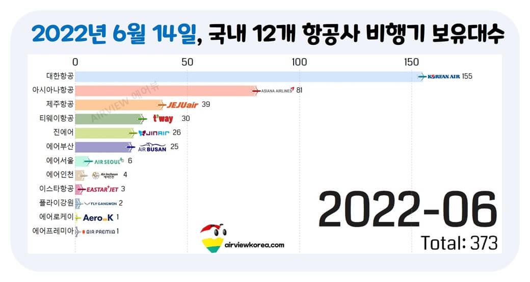 우리나라 12개 항공사 비행기 보유대수