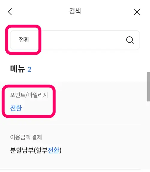 검색 결과 메뉴 중, [포인트/ 마일리지, 전환]을 눌러줍니다.