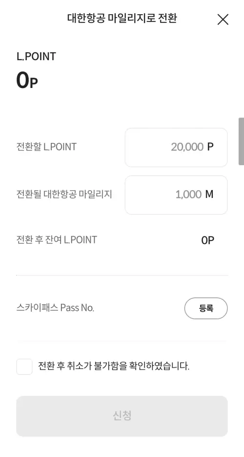 6. LPOINT를 얼마나 전환할지 입력 후 신청 클릭