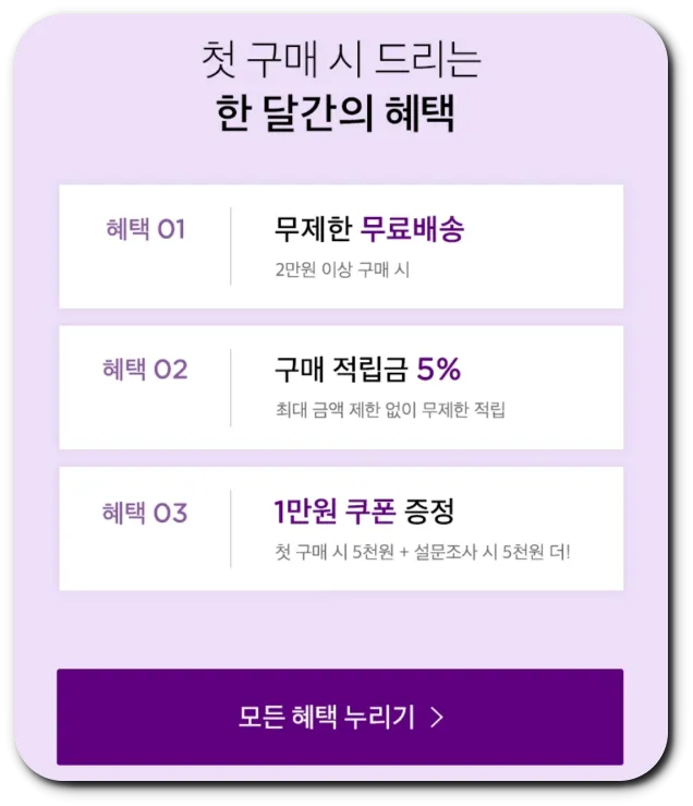 - 첫구매 후 설문조사하면 추가 1만원 쿠폰