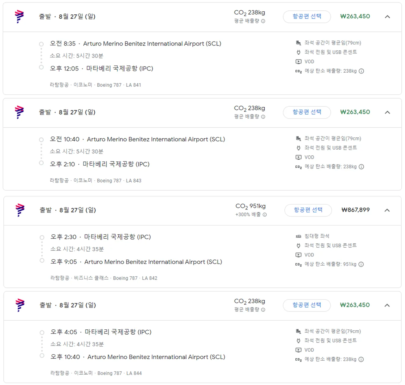 산티아고-이스터섬 왕복 항공편 운항일정표