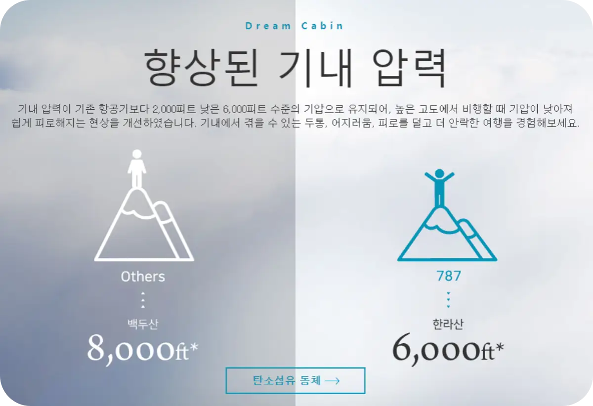 대한항공에서 소개하는 자료에서 보는 것과 같이 기존 금속 기체들은 보통 8000ft 기준의 기내 압력 수준을 유지하지만,