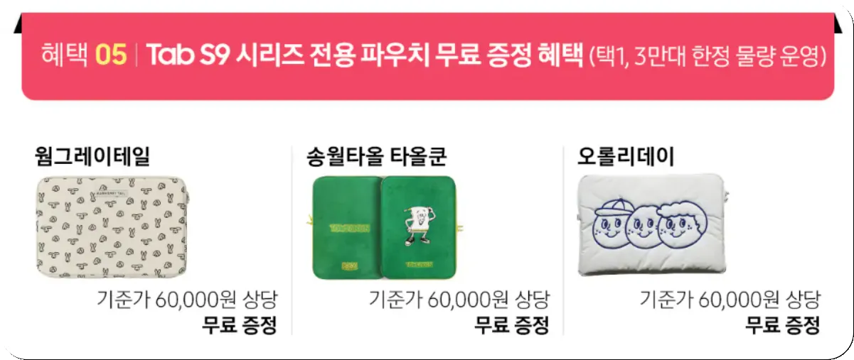 6만원 상당의 갤탭S9 파우치 3가지 중 1개를 무료로 받을 수 있습니다