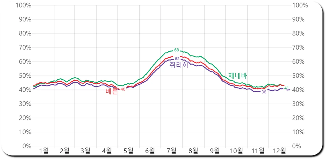 스위스 월별 비올 확률, 해뜰 확률은 얼마나 돼?