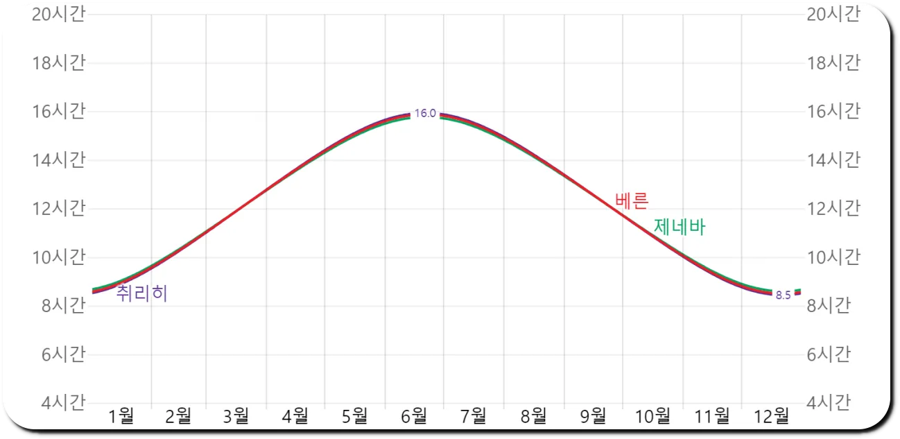 스위스의 땅이 크지 않기 때문에 일광 시간은 거의 비슷합니다