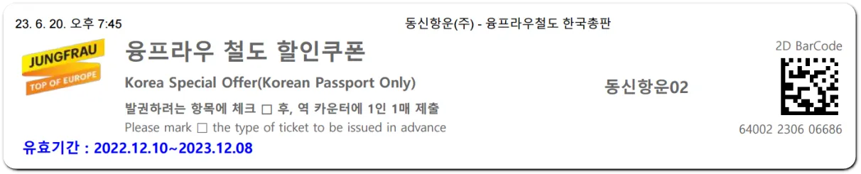 스위스의 융프라우철도 관련 한국 공식 총판인 동신항운에서 쿠폰을 가져가면