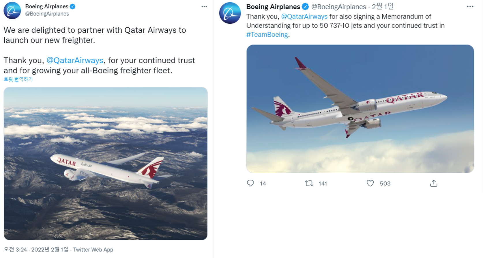 카타르항공은 보잉사의 B777XF, B737MAX 기종을 100대 계약했습니다.