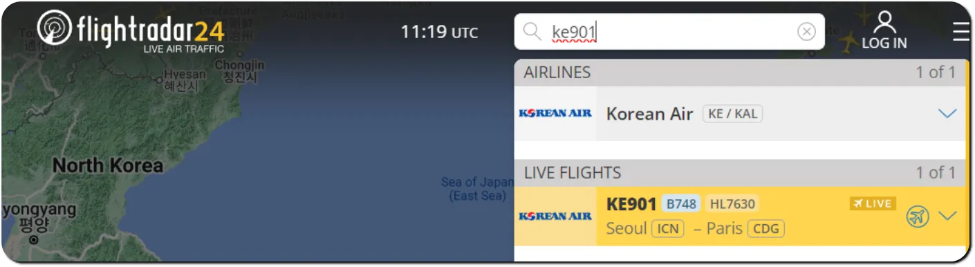 KE901을 검색해보면 해당 항공편이 조회된다