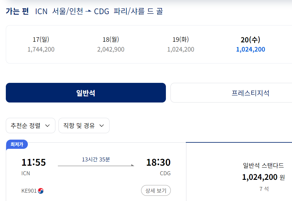 인천에서 파리 샤를드골 국제공항(CDG)로 가는 대한항공 KE901편 기준으로 확인해보겠다
