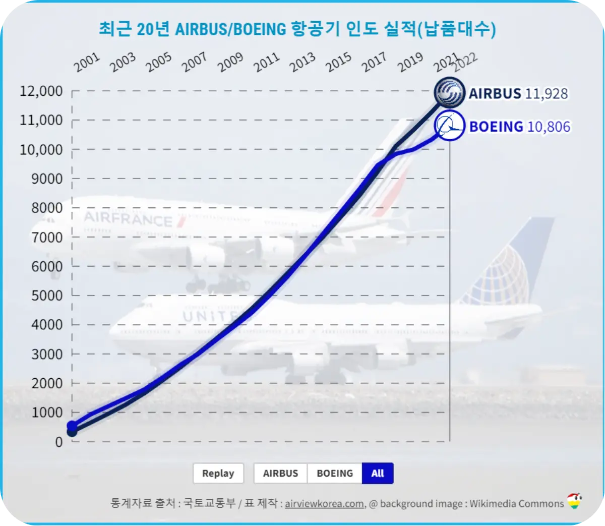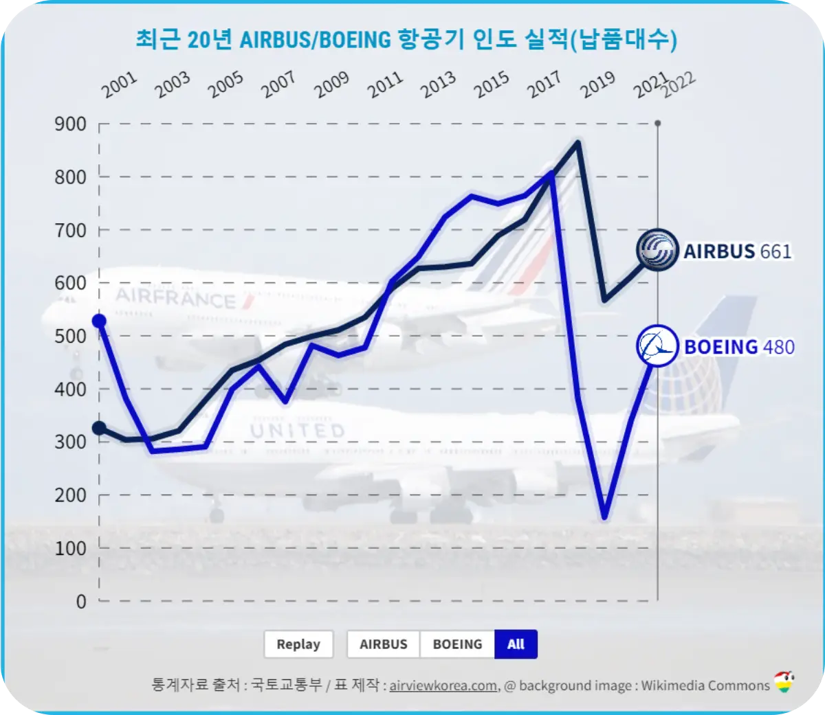 최근 20년, 보잉과 에어버스는 항공사에 비행기를 몇대나 팔았을까?