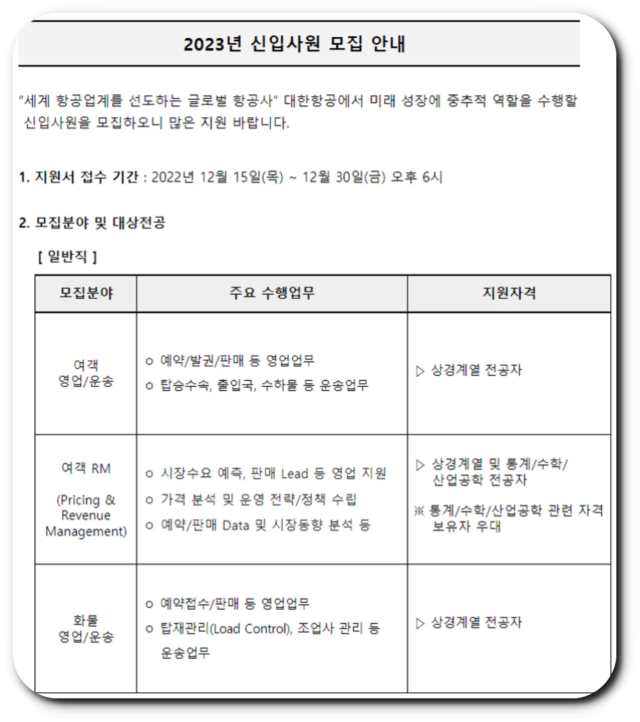 2023년도 대한항공 신입 대졸공채 공고를 보면,