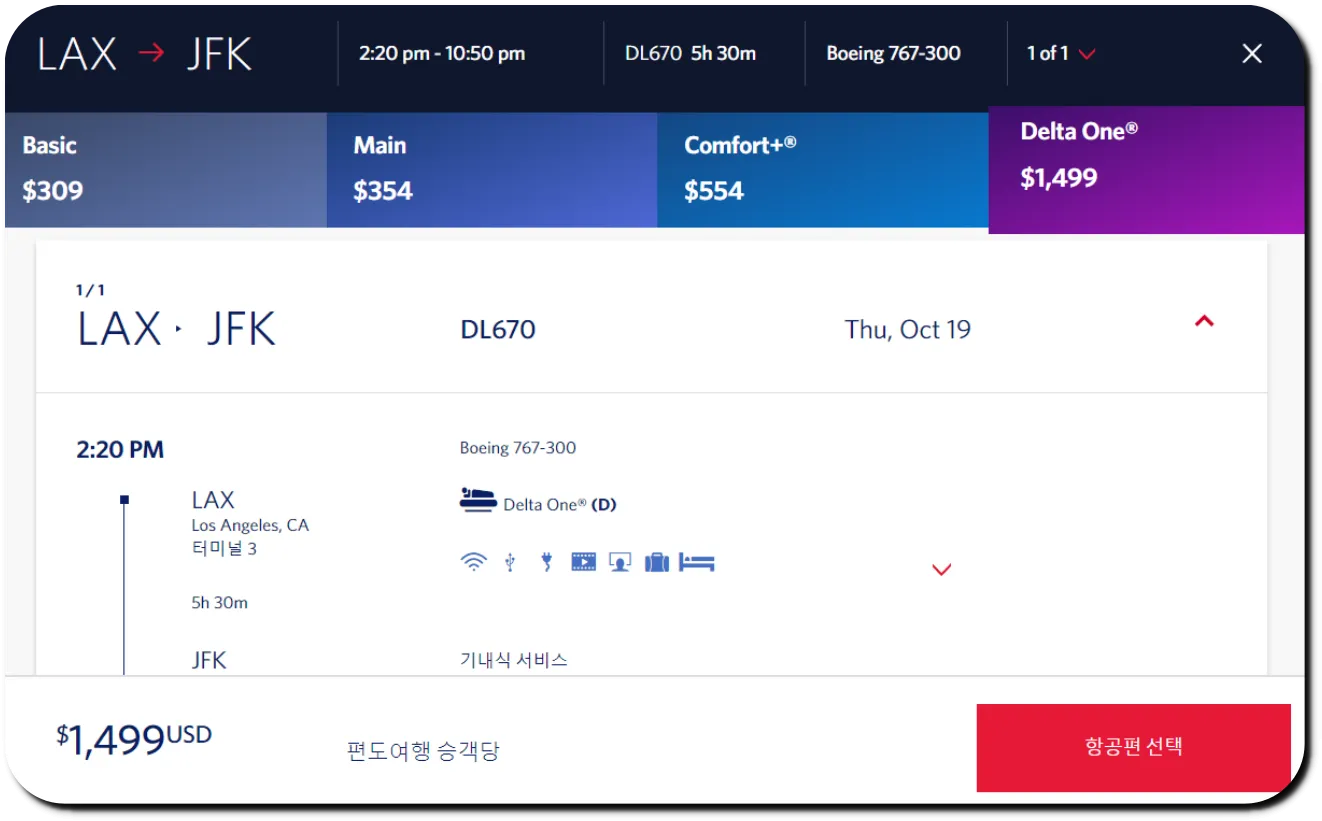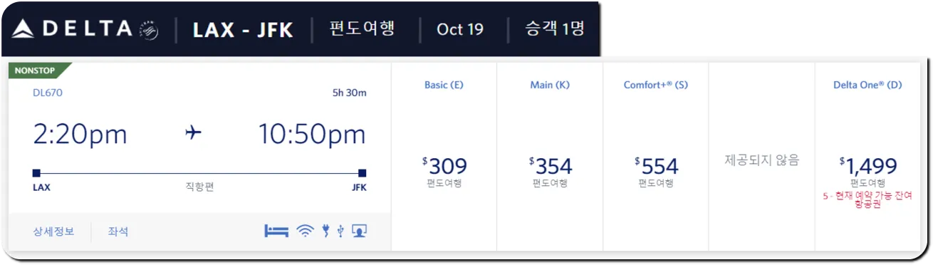 | 델타항공 LA-뉴욕 항공편 좌석 등급 |