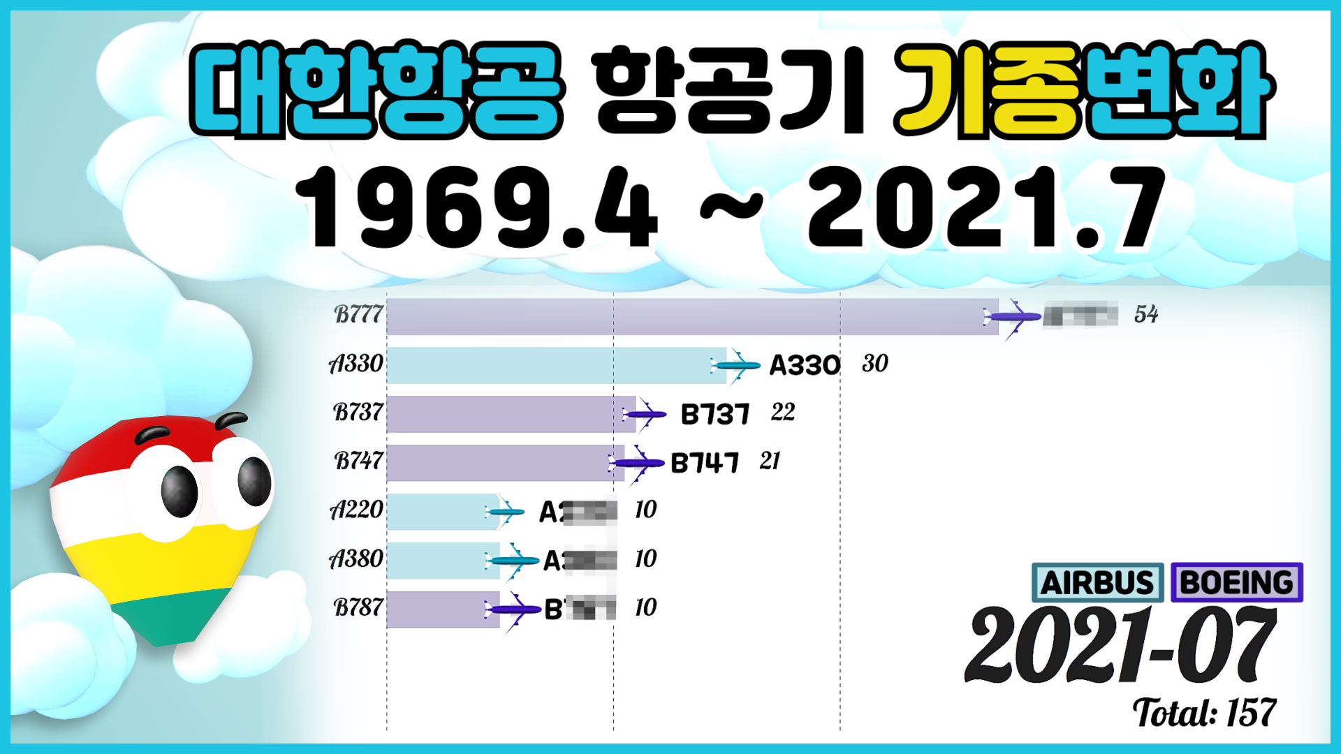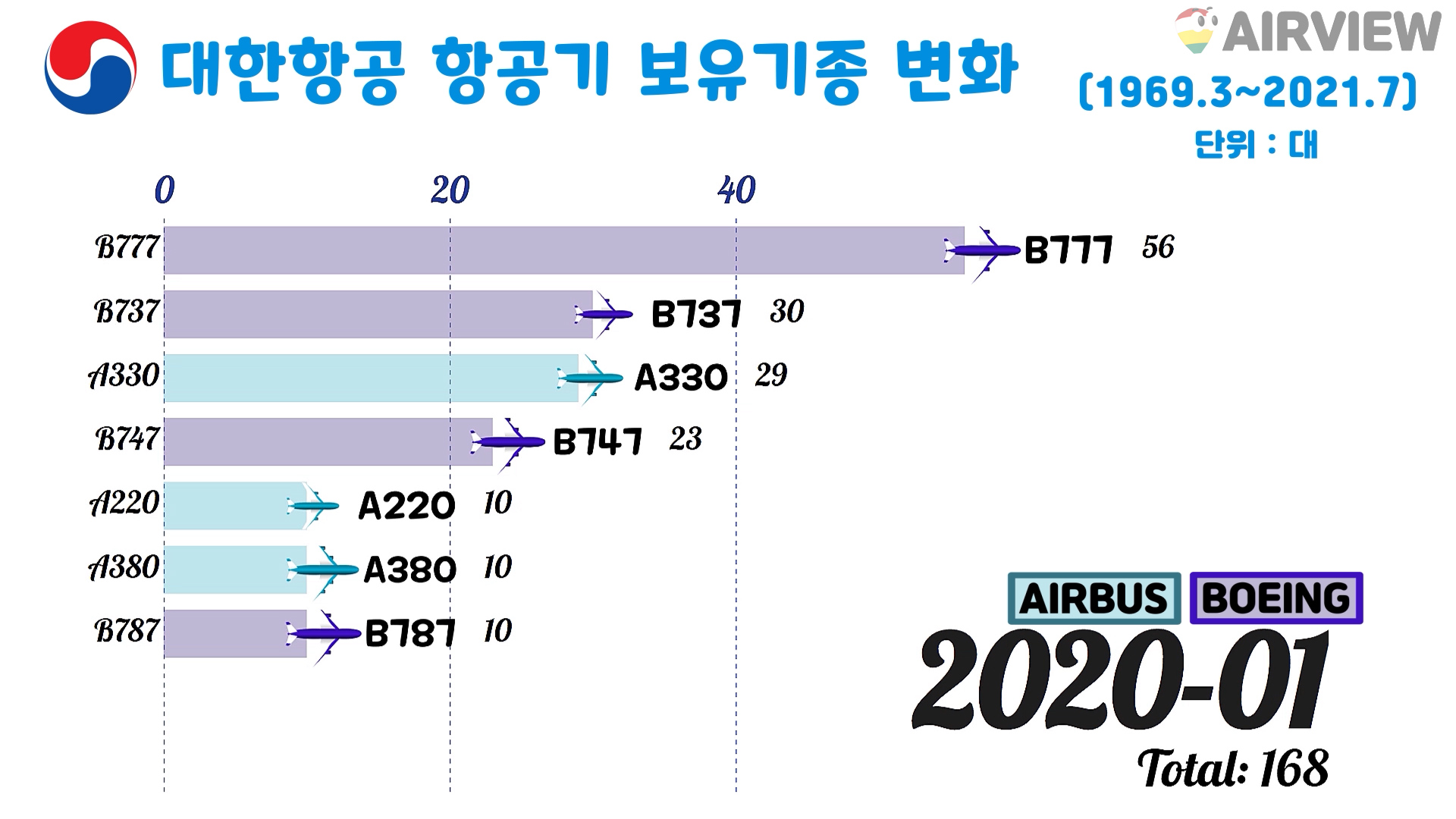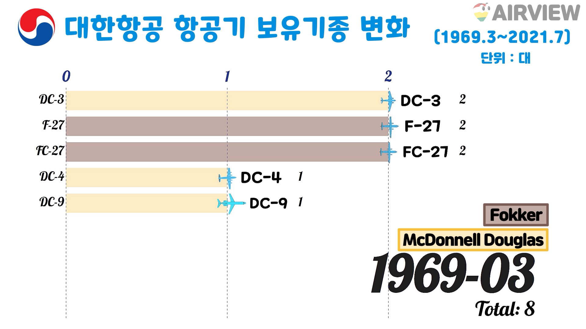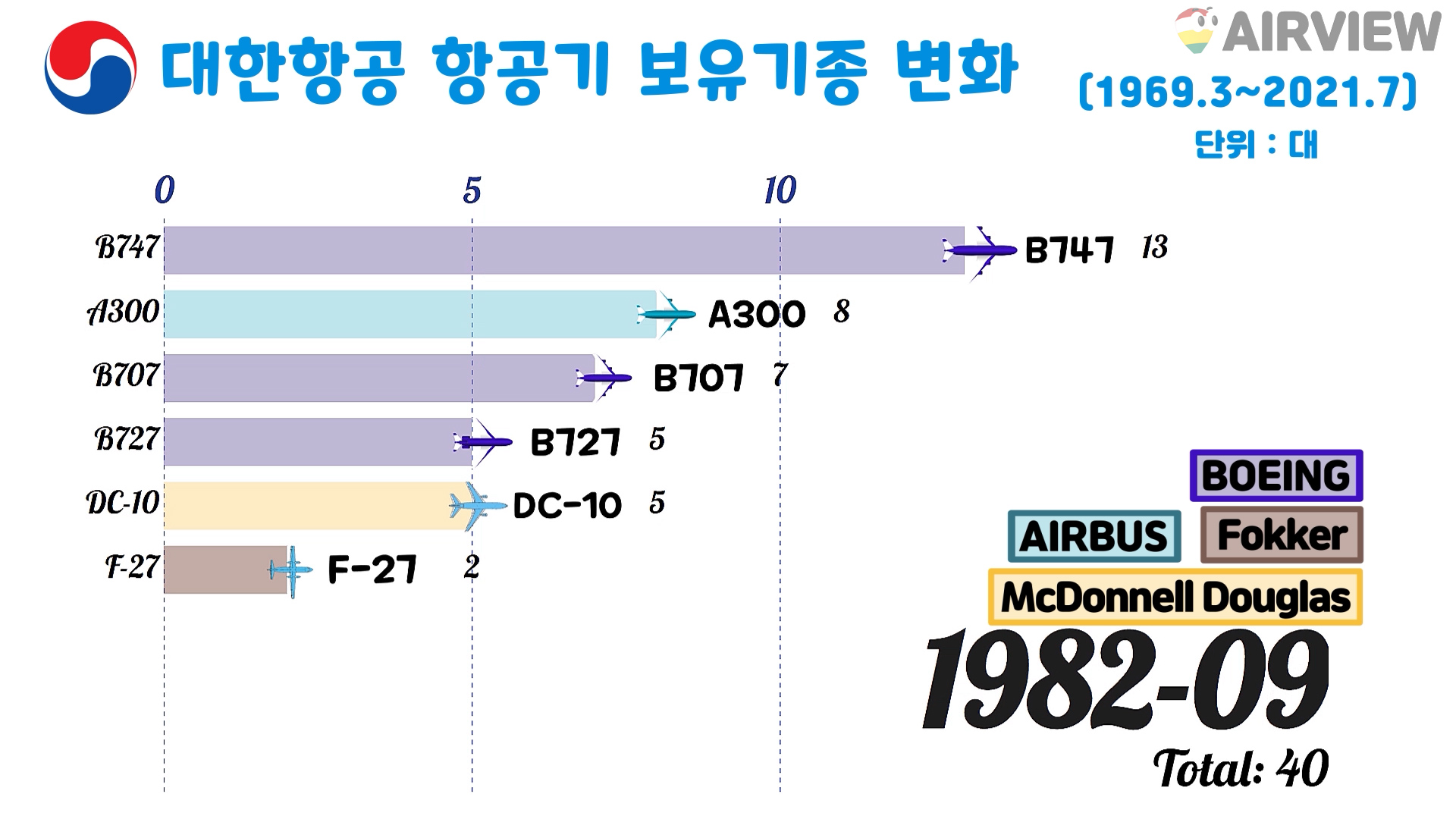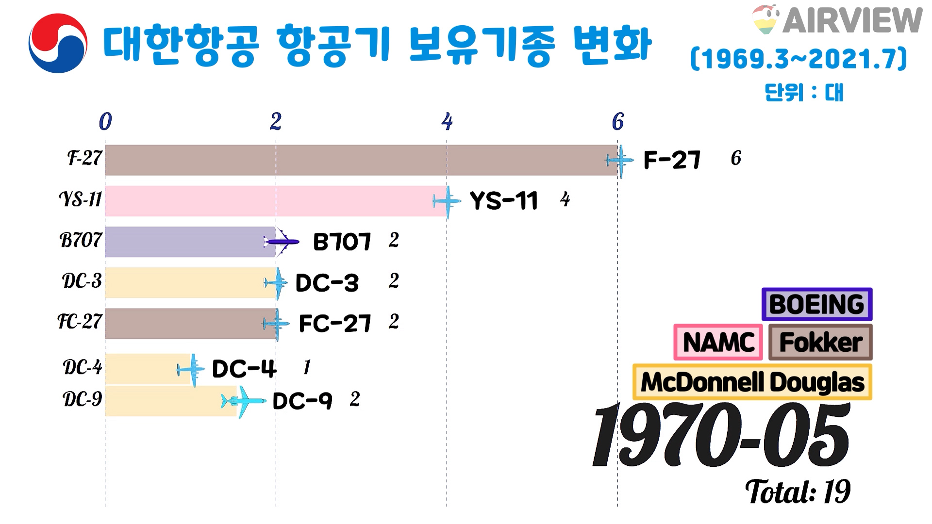 1969.3~2021.7 대한항공 항공기 보유대수/보유기종 변화 (비행기 BOEING AIRBUS NAMC Fokker McDonnell Douglas)
