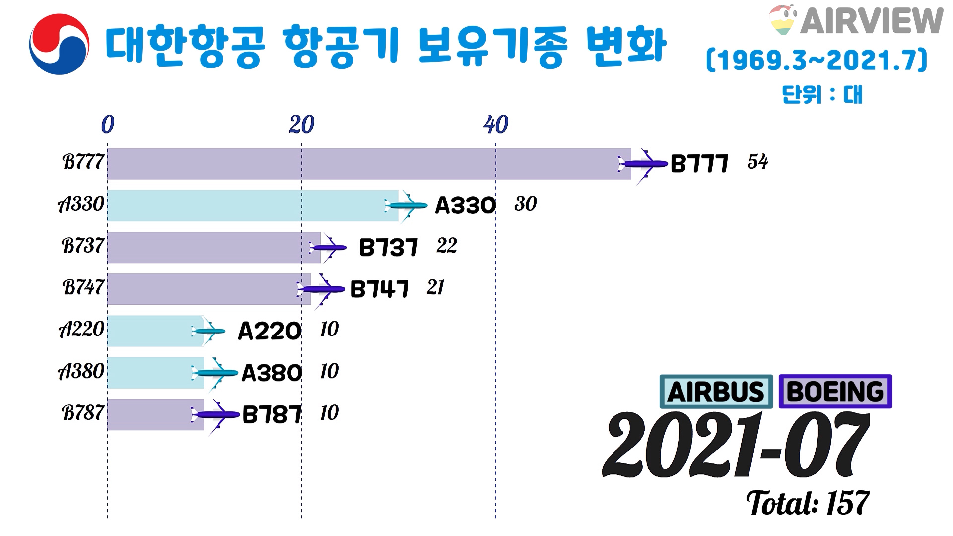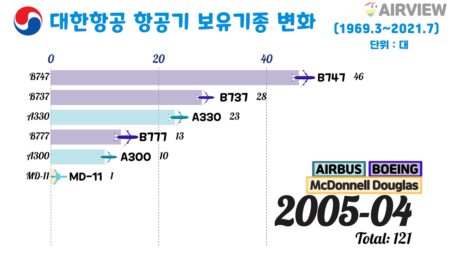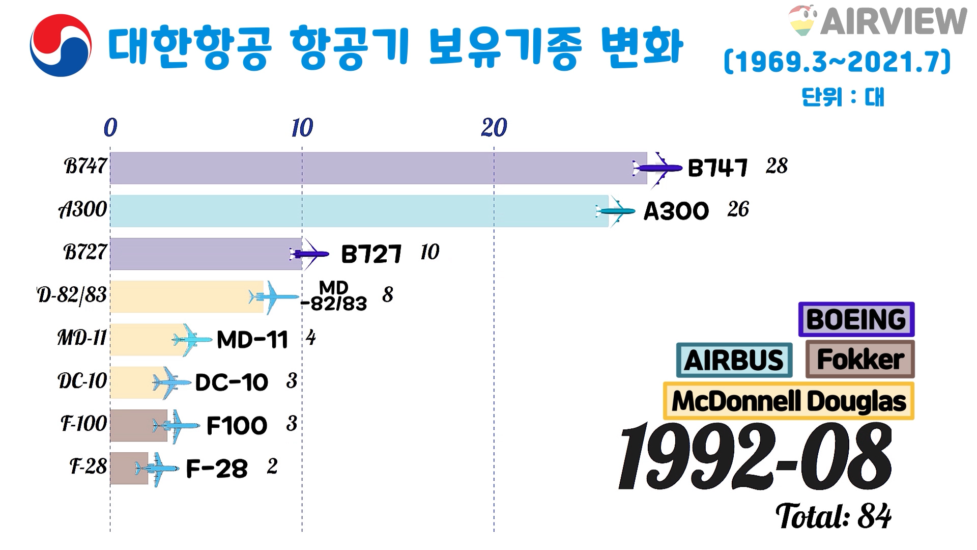 [1969~2021년 7월] 대한항공 비행기 보유대수/보유기종 변화 (비행기 BOEING AIRBUS NAMC Fokker McDonnell Douglas)