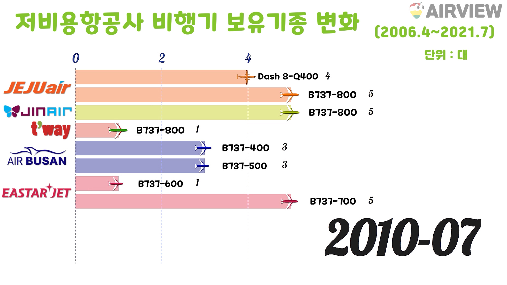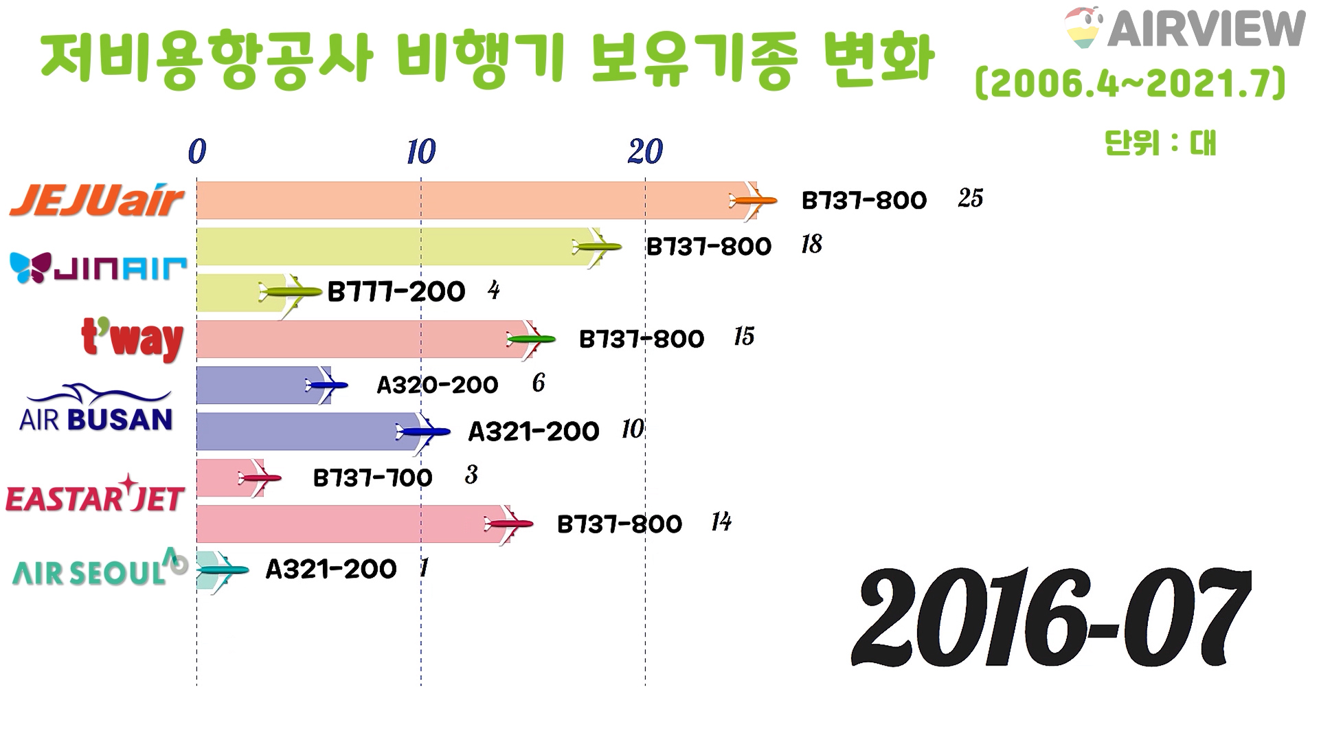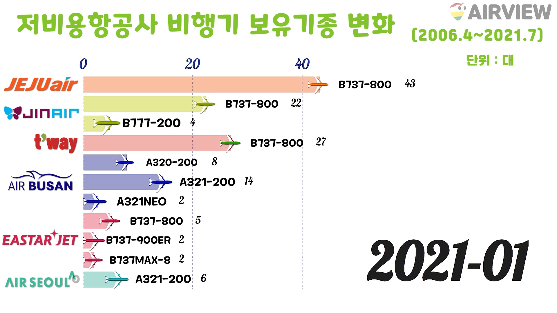 [2006~2021년 7월] 우리나라 한국 저비용항공사(LCC) 6개 비행기(항공기) 보유기종 변화