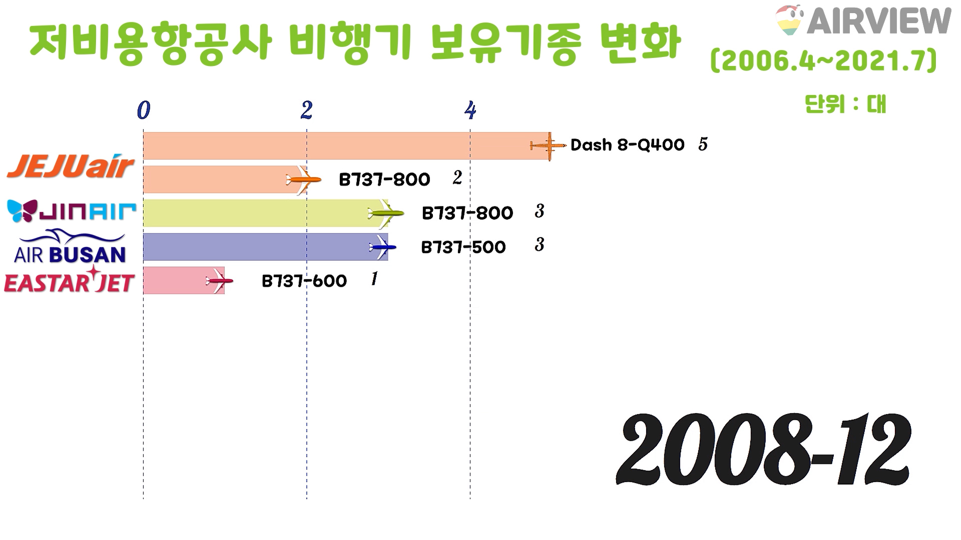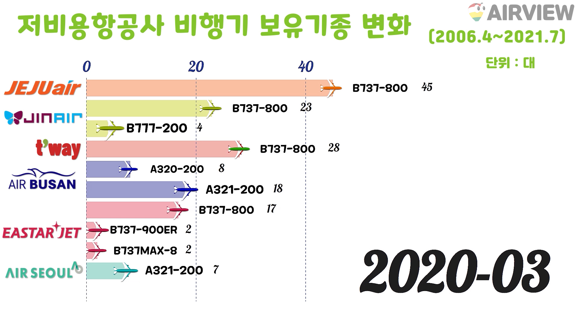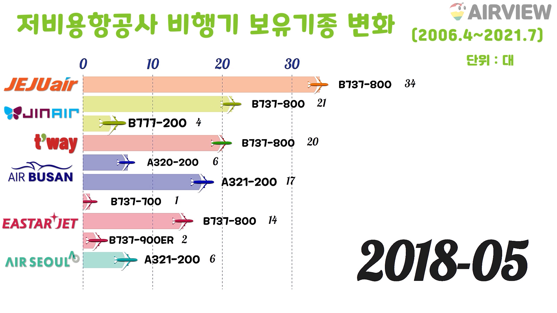 [2006~2021년 7월] 우리나라 한국 저비용항공사(LCC) 6개 비행기(항공기) 보유기종 변화