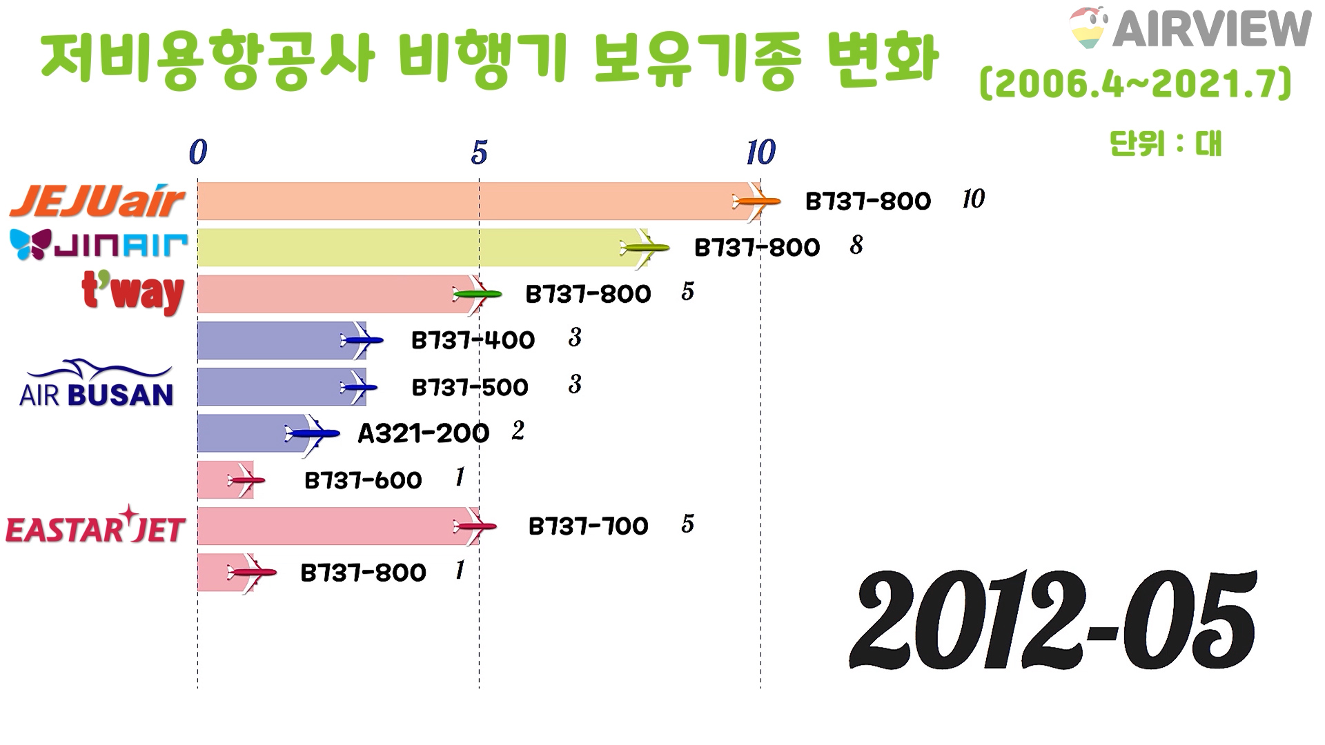 [2021년 7월 기준] 최근 10년 티웨이항공 비행기 보유기종/보유대수 변화 (항공기 보잉 B737-800)