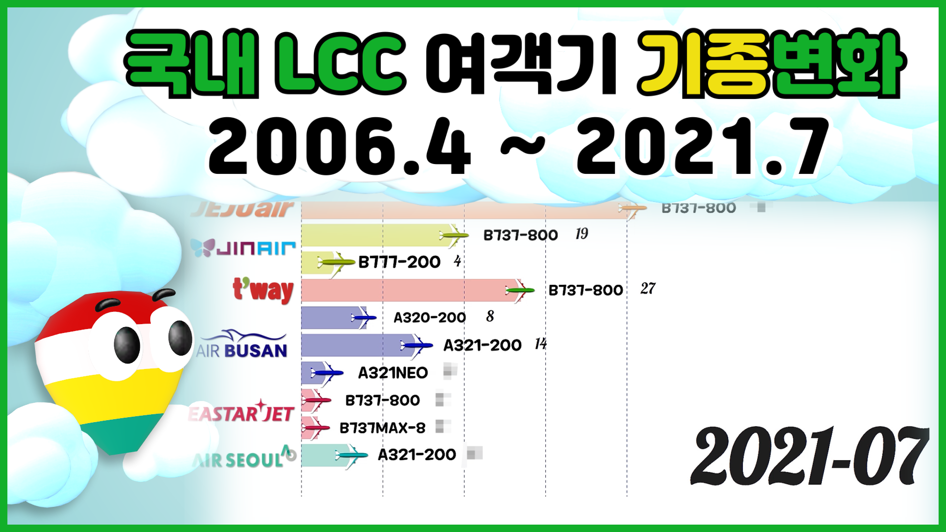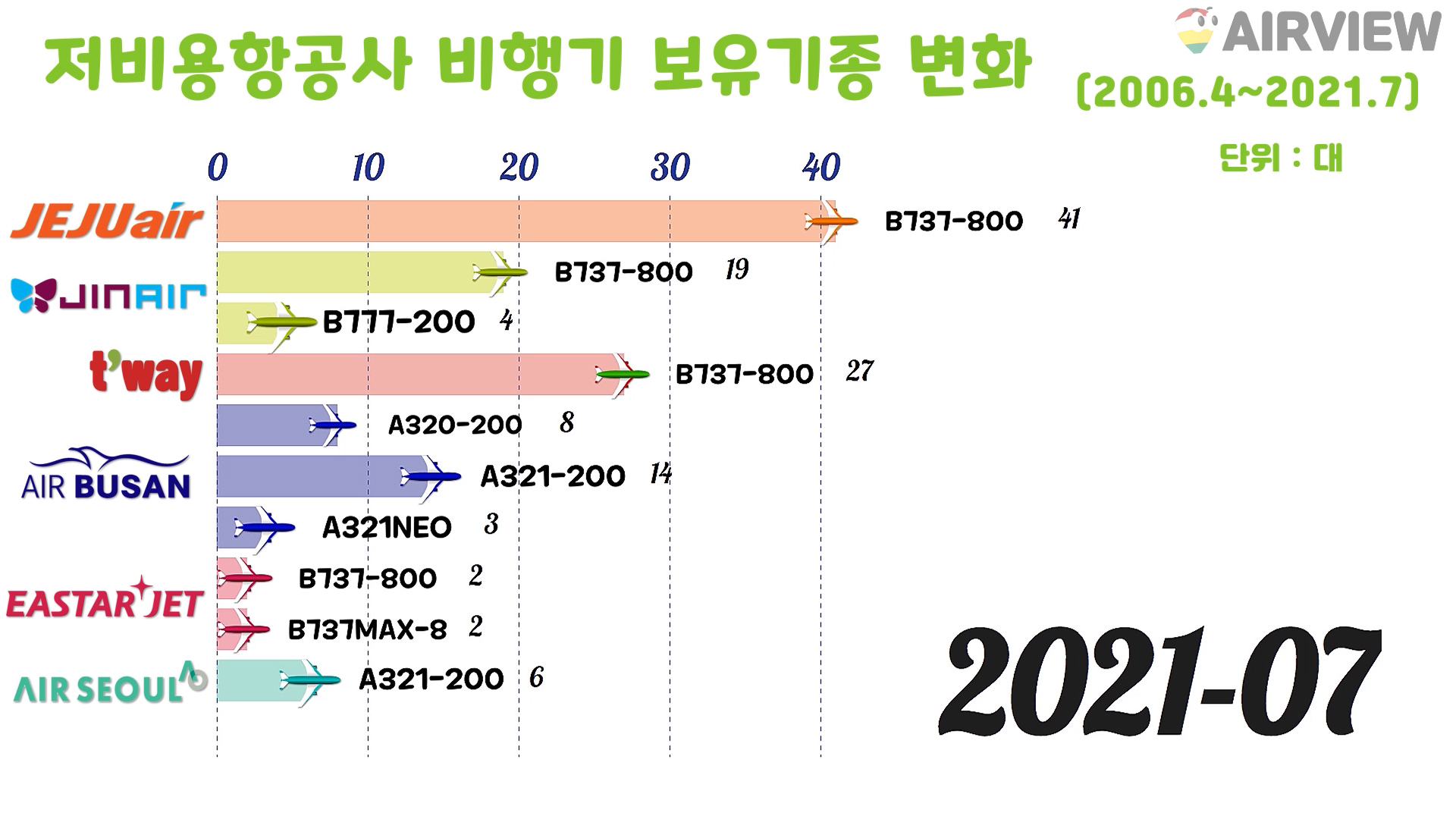 [2006~2021년 7월] 우리나라 한국 저비용항공사(LCC) 6개 비행기(항공기) 보유기종 변화