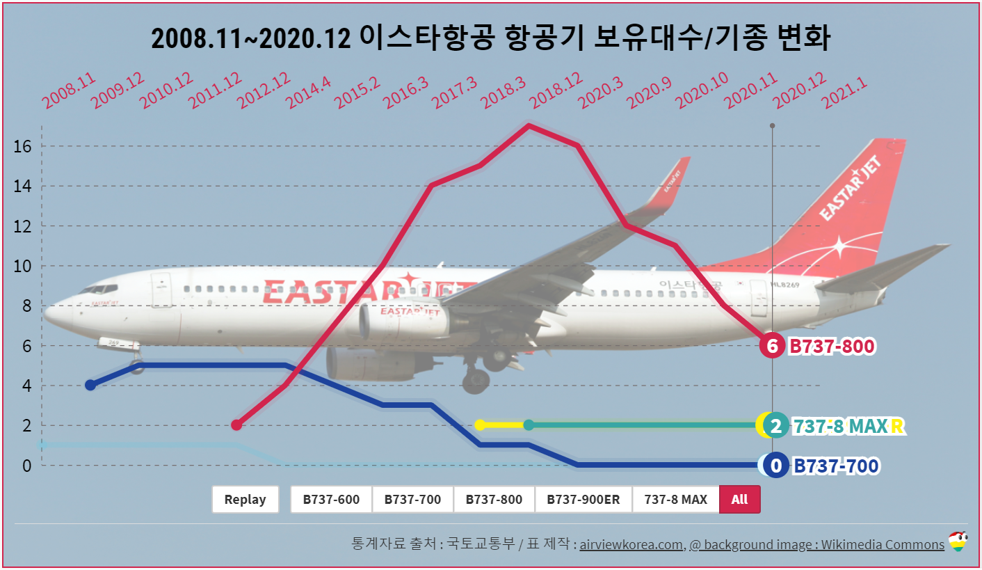 2008.11~2021.1 이스타항공 항공기 보유기종/보유대수 변화 (비행기 보잉 B737-600/-700/-800/-900ER/MAX)