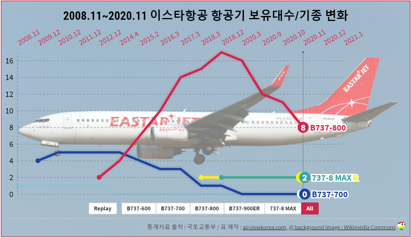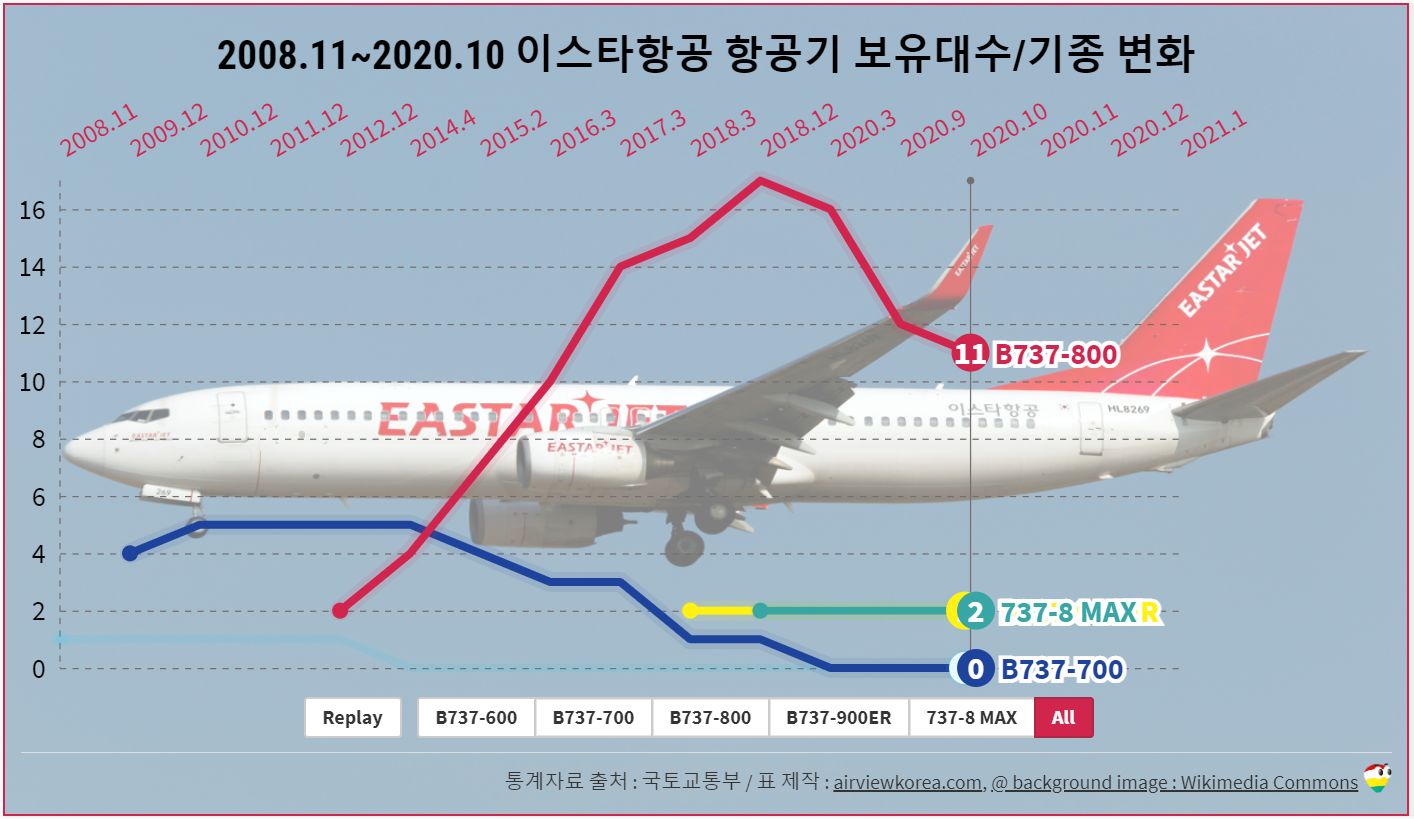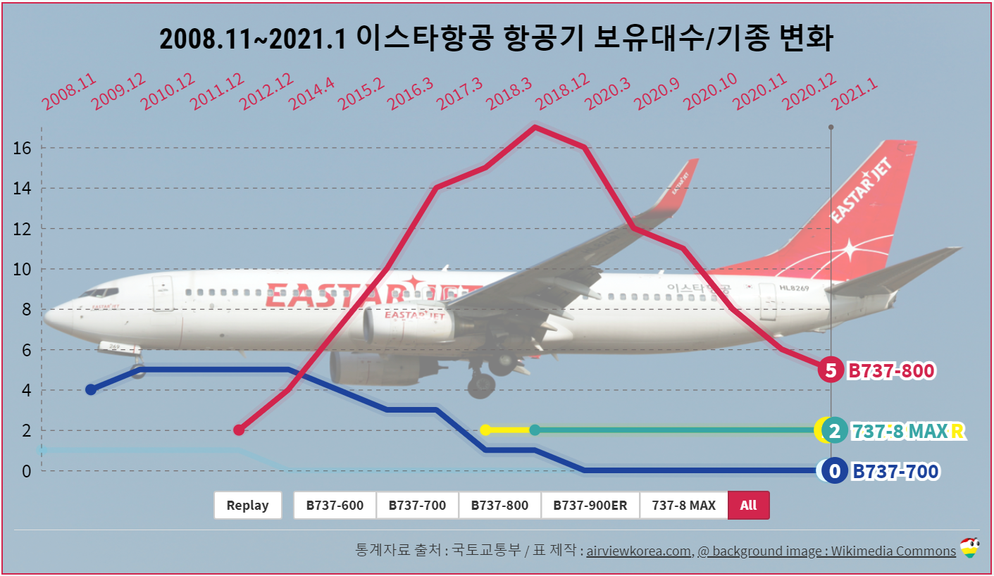 2008.11~2021.1 이스타항공 항공기 보유기종/보유대수 변화 (비행기 보잉 B737-600/-700/-800/-900ER/MAX)