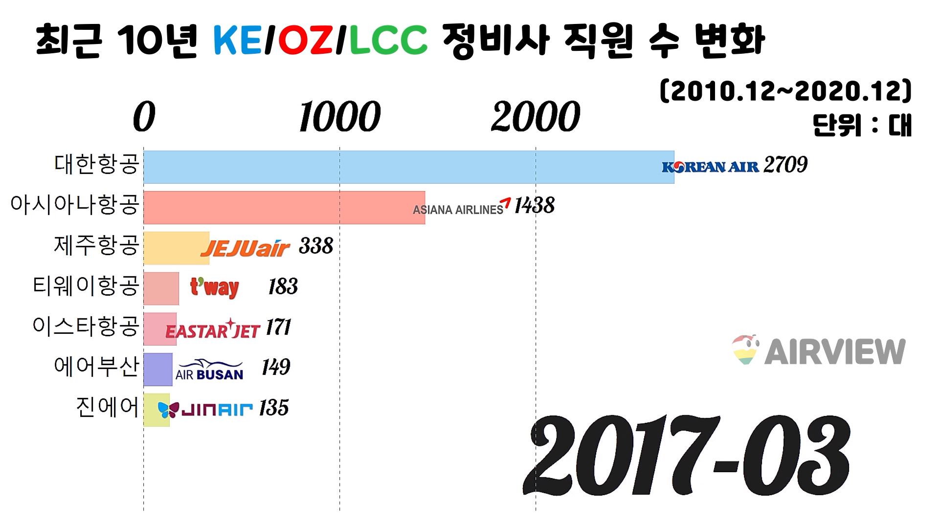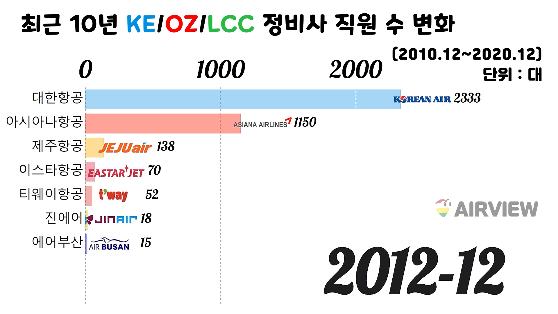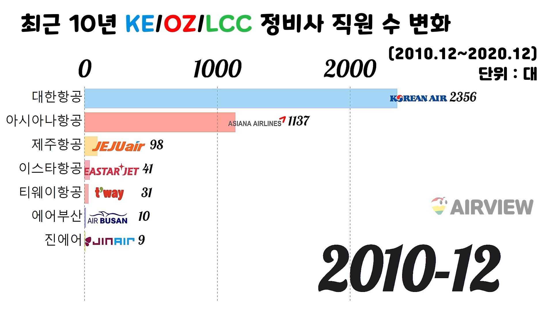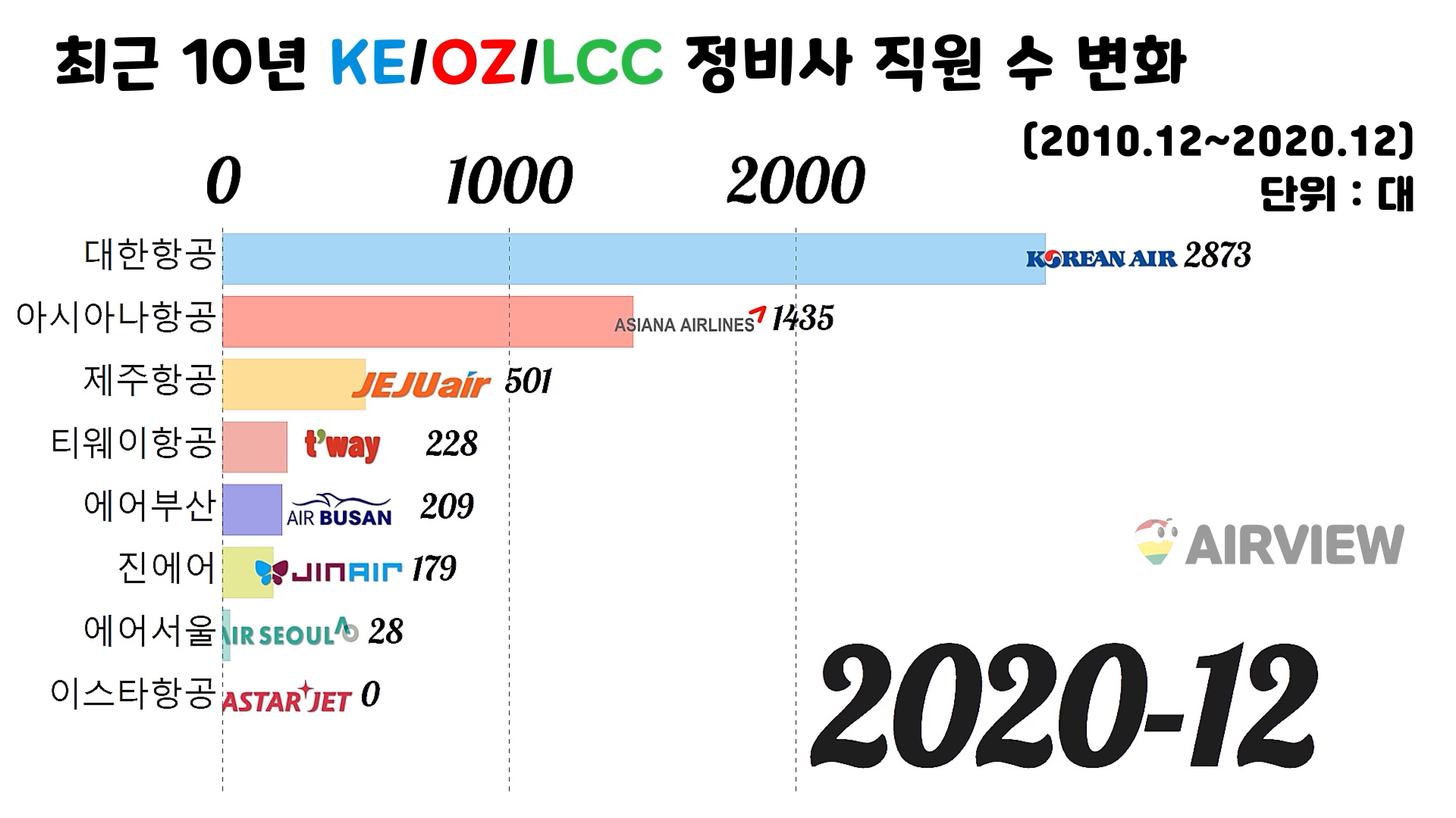 [2010-2020년 12월 기준] 대한민국 한국 국내 8개 항공사에 항공정비사 직원 수는 몇명? 최근 10년 현황 변화 (대한항공/아시아나항공/제주항공/진에어/에어부산/에어서울/이스타항공/티웨이항공)