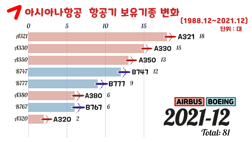 [~2021년 12월] 최근 10년 아시아나항공 비행기는 몇대? 보유대수/보유기종 변화 (BOEING[보잉] AIRBUS[에어버스] 항공기)