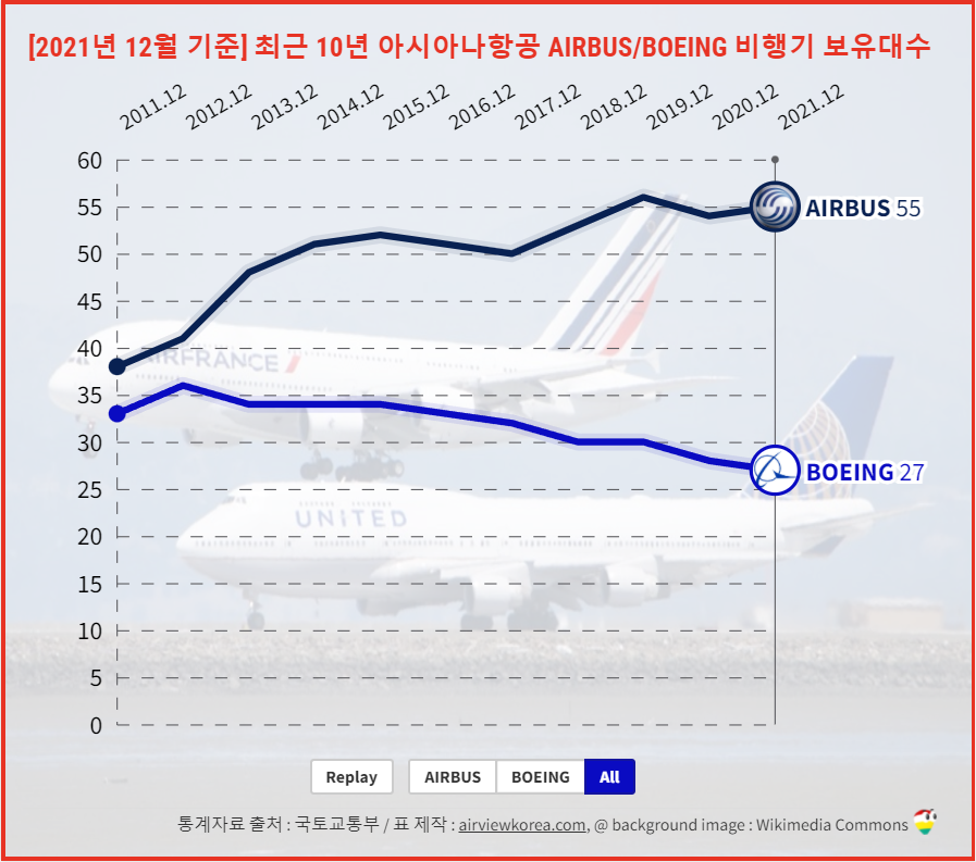 [~2021년 12월] 최근 10년 아시아나항공 항공기종/종류 변화 (BOEING[보잉] AIRBUS[에어버스] 비행기)