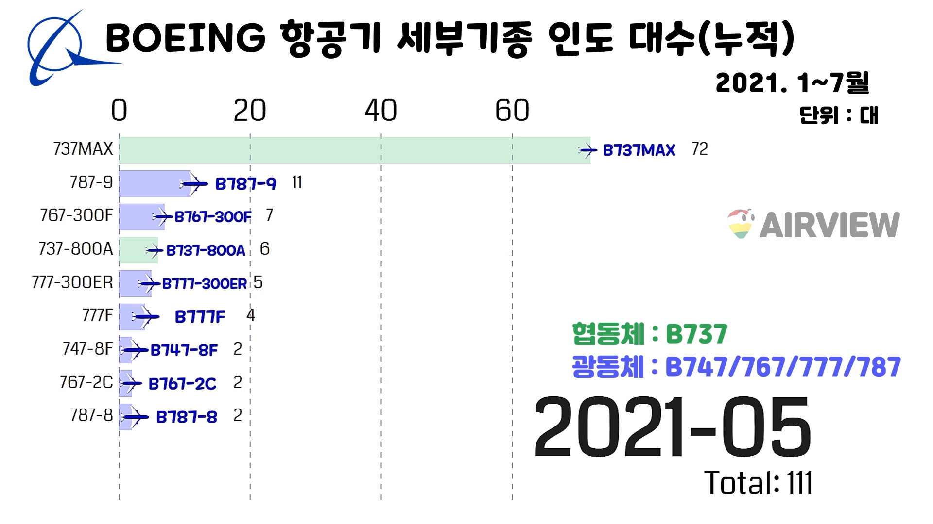 [2021년 1~7월] 보잉 BOEING 상업용 비행기 인도(판매실적) 세부기종/대수
