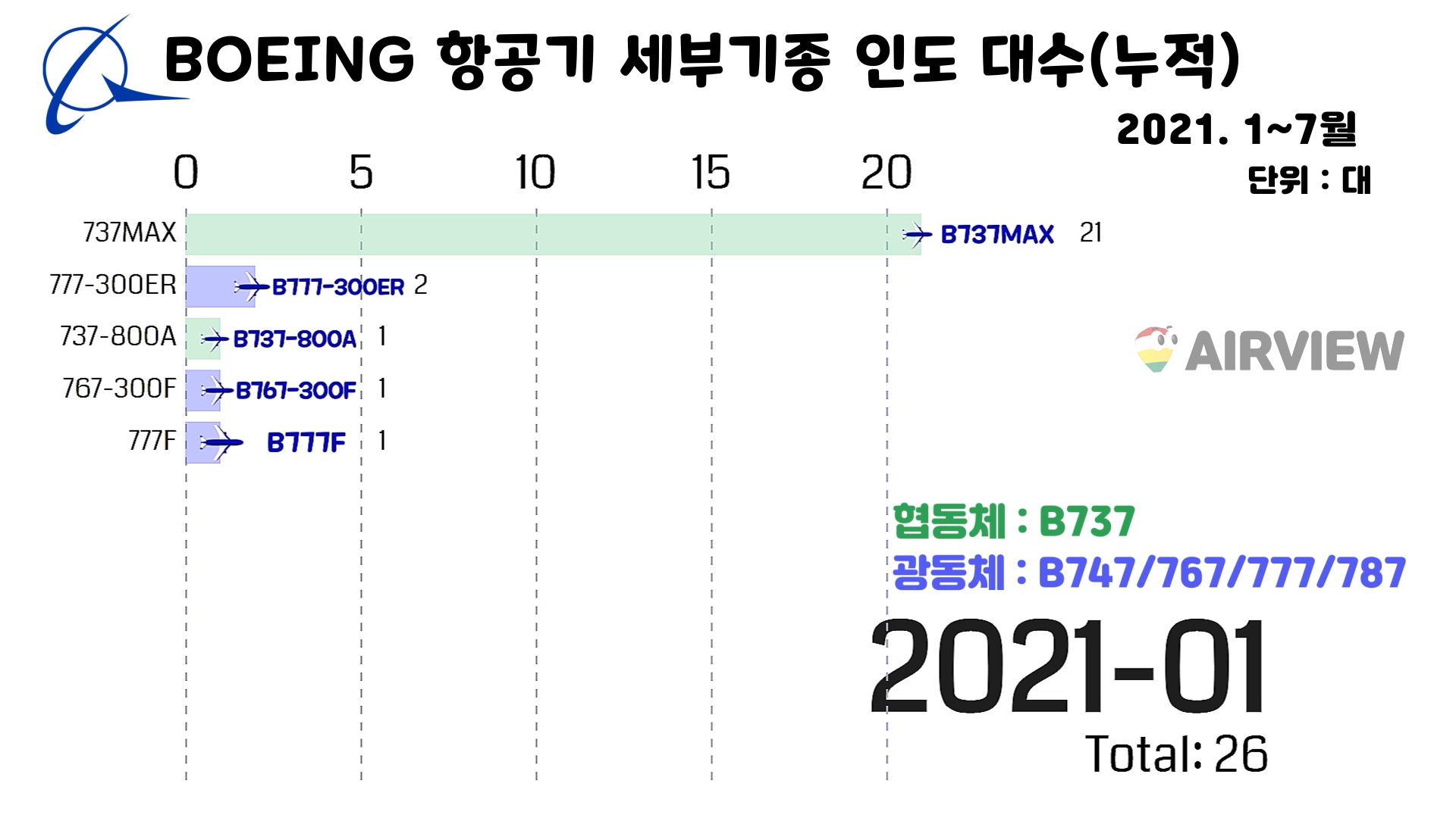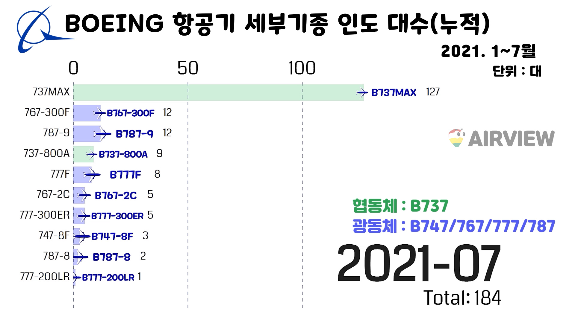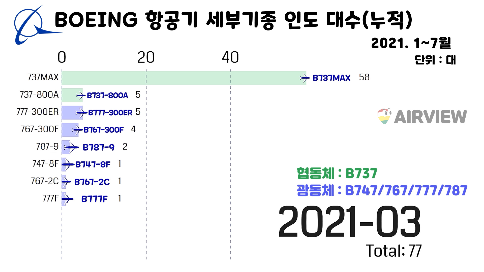 [2021년 1~7월] 보잉 BOEING 상업용 비행기 인도(판매실적) 세부기종/대수