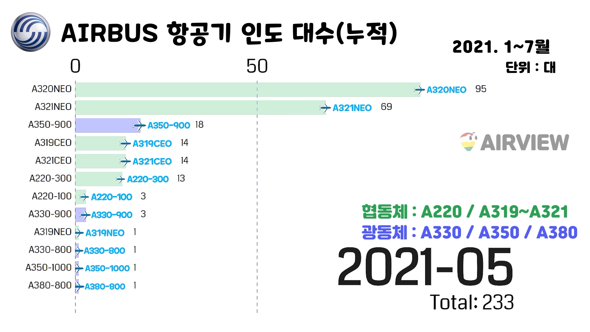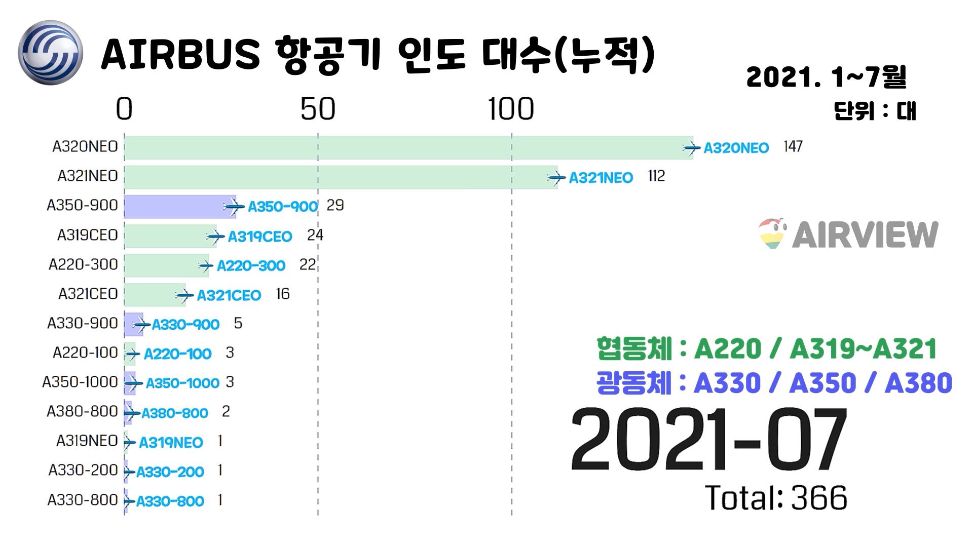 [2021년 1~7월] 에어버스 AIRBUS 상업용 비행기 인도(판매실적) 종류/세부기종/대수