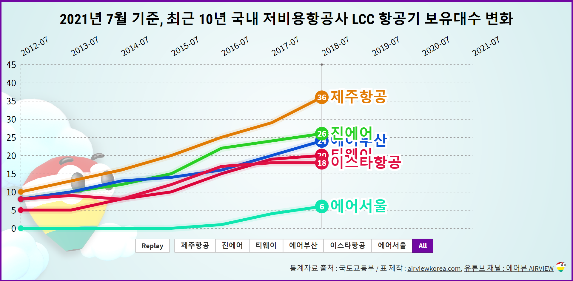 [2021년 7월 기준] 최근 10년 우리나라 저가항공사 LCC 비행기 보유대수 변화 현황