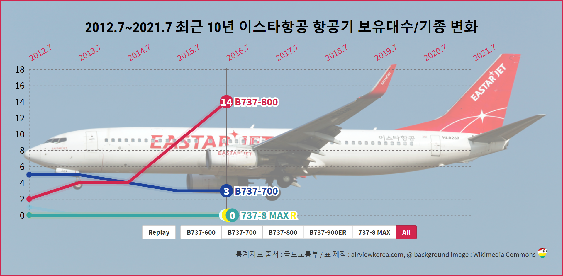 [2021년 7월 기준] 최근 10년 이스타항공 비행기 보유기종/보유대수 변화 (항공기 보잉 B737-800 / B737-8MAX)