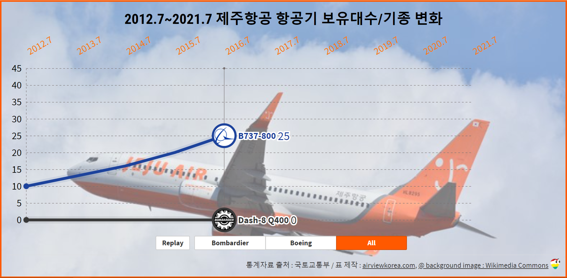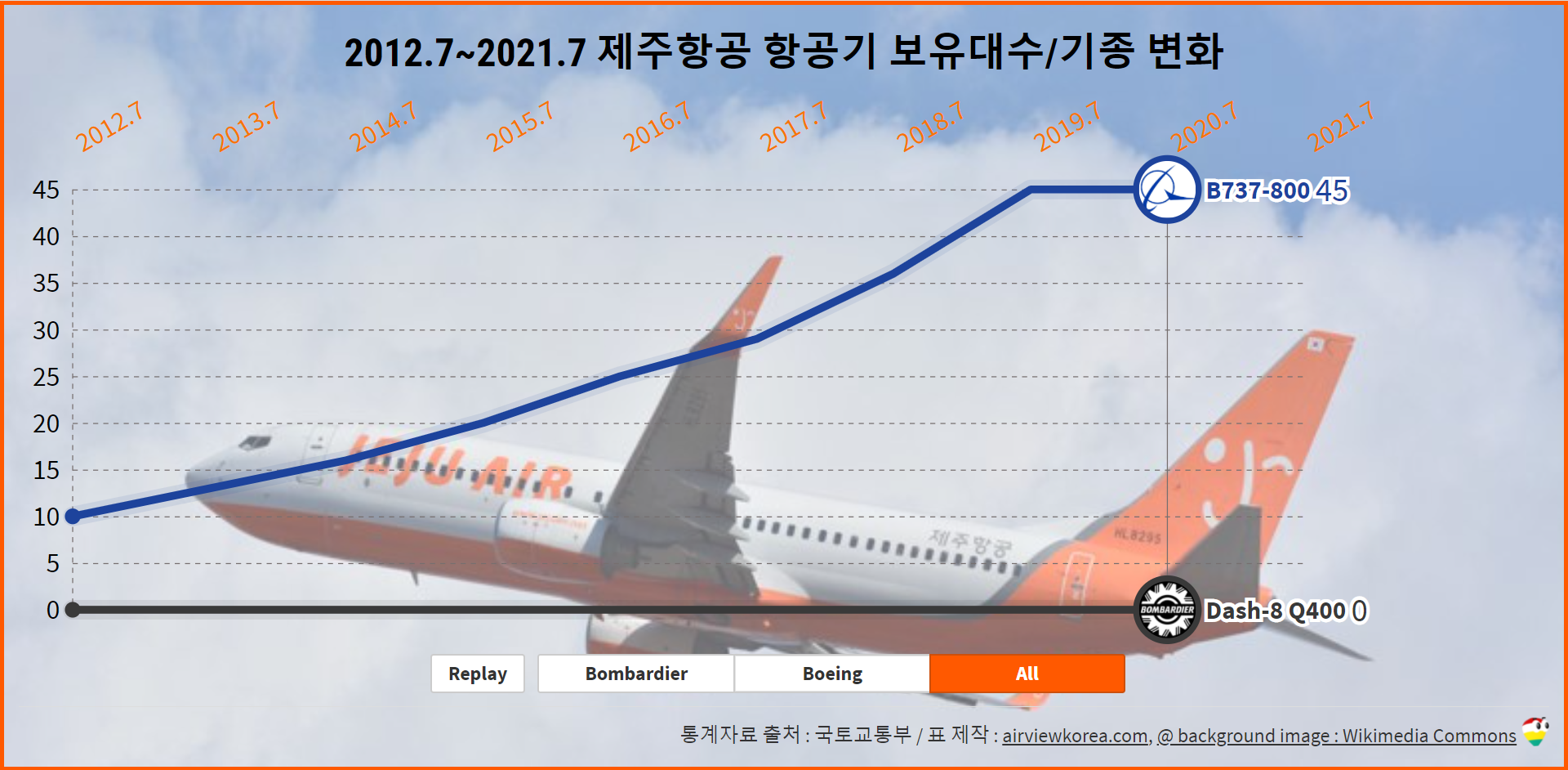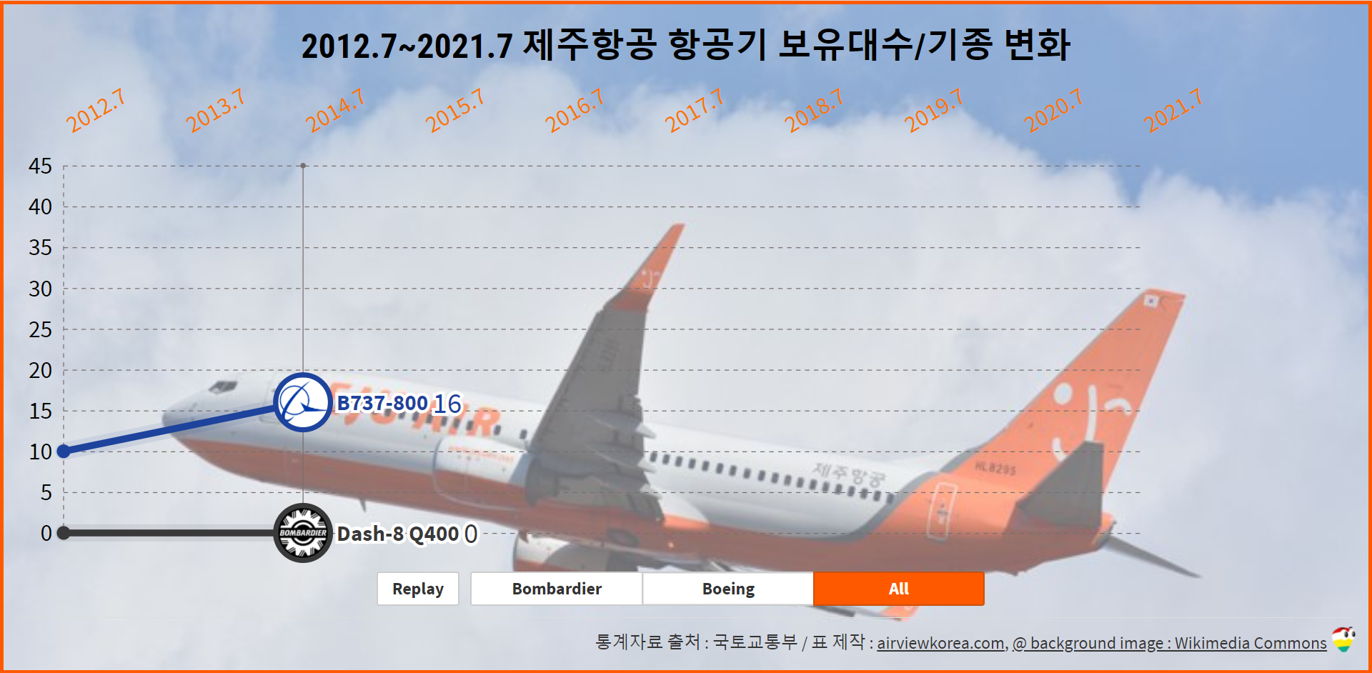 2006.4~2020.9 제주항공 항공기 보유기종/보유대수 변화 (비행기 보잉 B737/봄바디어 Dash-8)