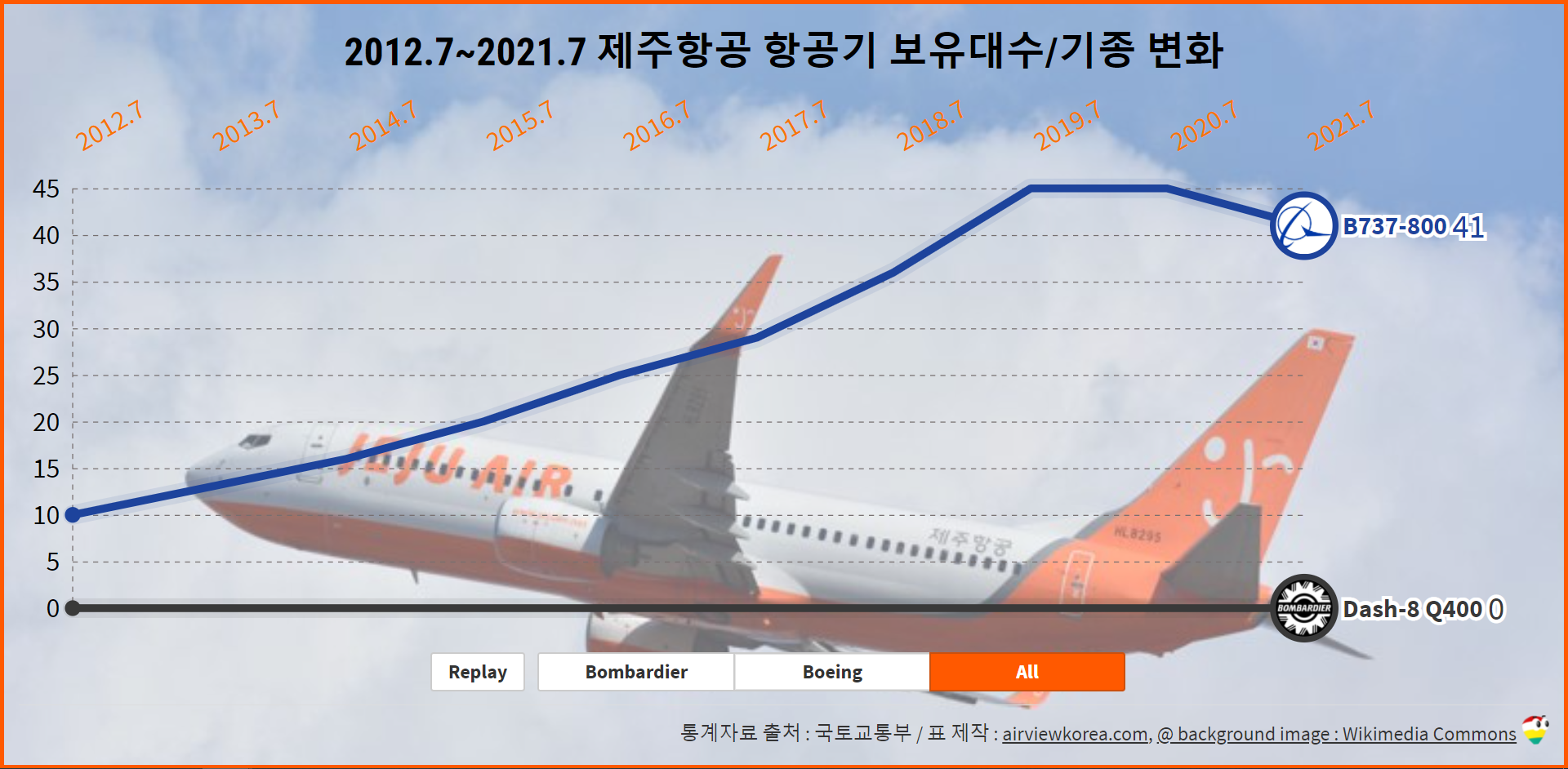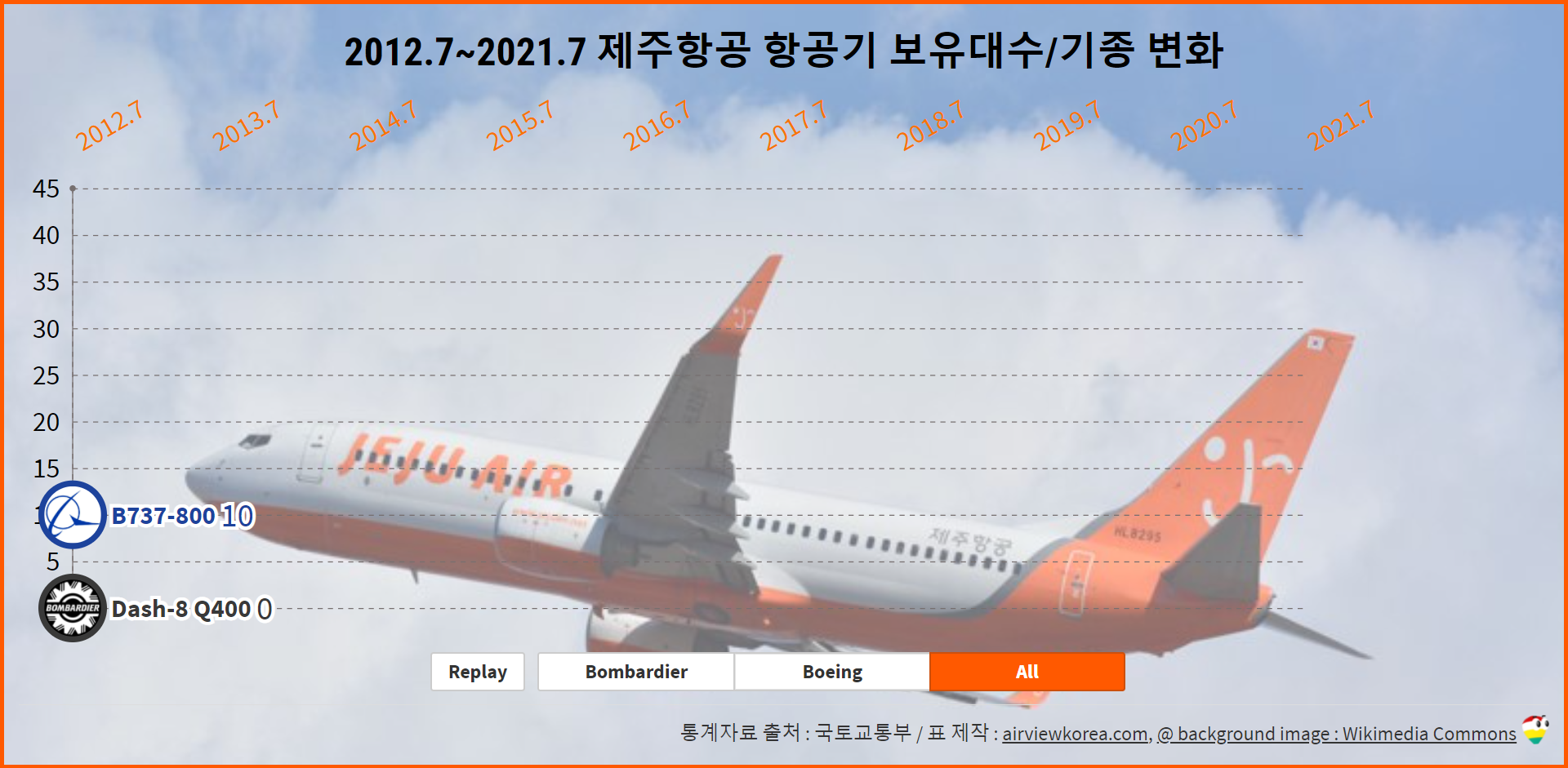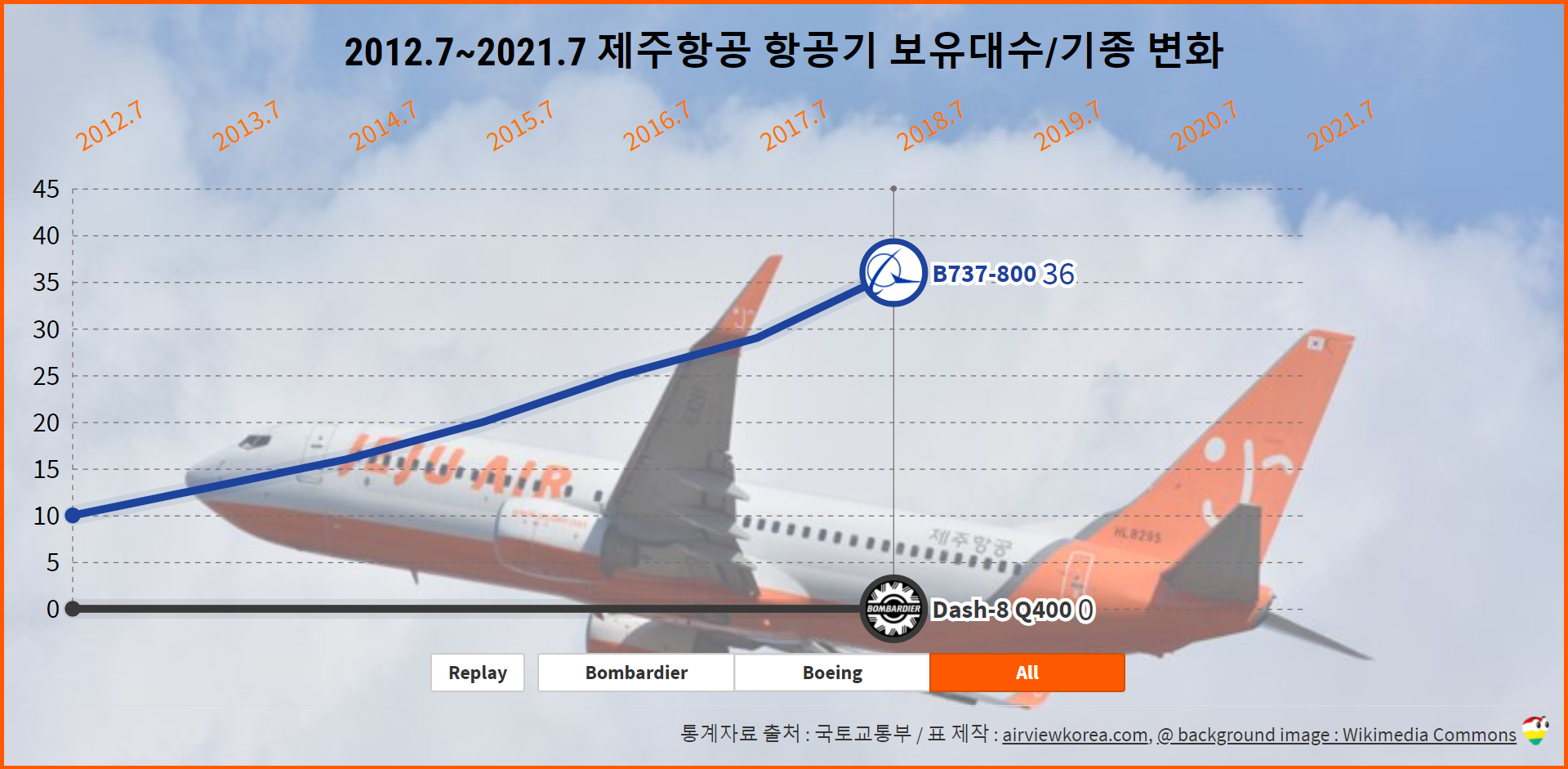 2006.4~2020.9 제주항공 항공기 보유기종/보유대수 변화 (비행기 보잉 B737/봄바디어 Dash-8)