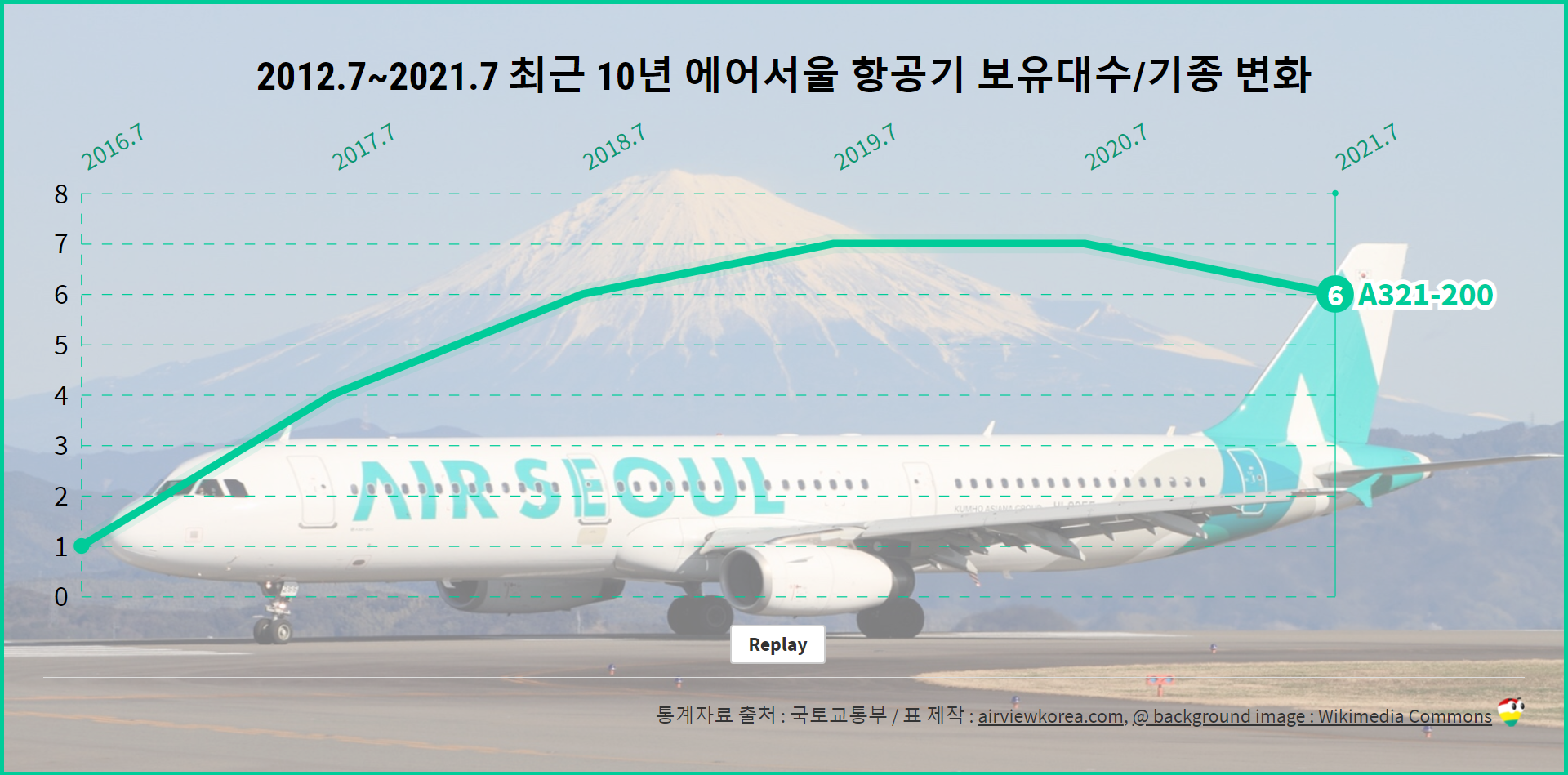[2021년 7월 기준] 최근 5년 에어서울 비행기 종류 보유기종/보유대수 변화 (항공기 에어버스 A321-200)