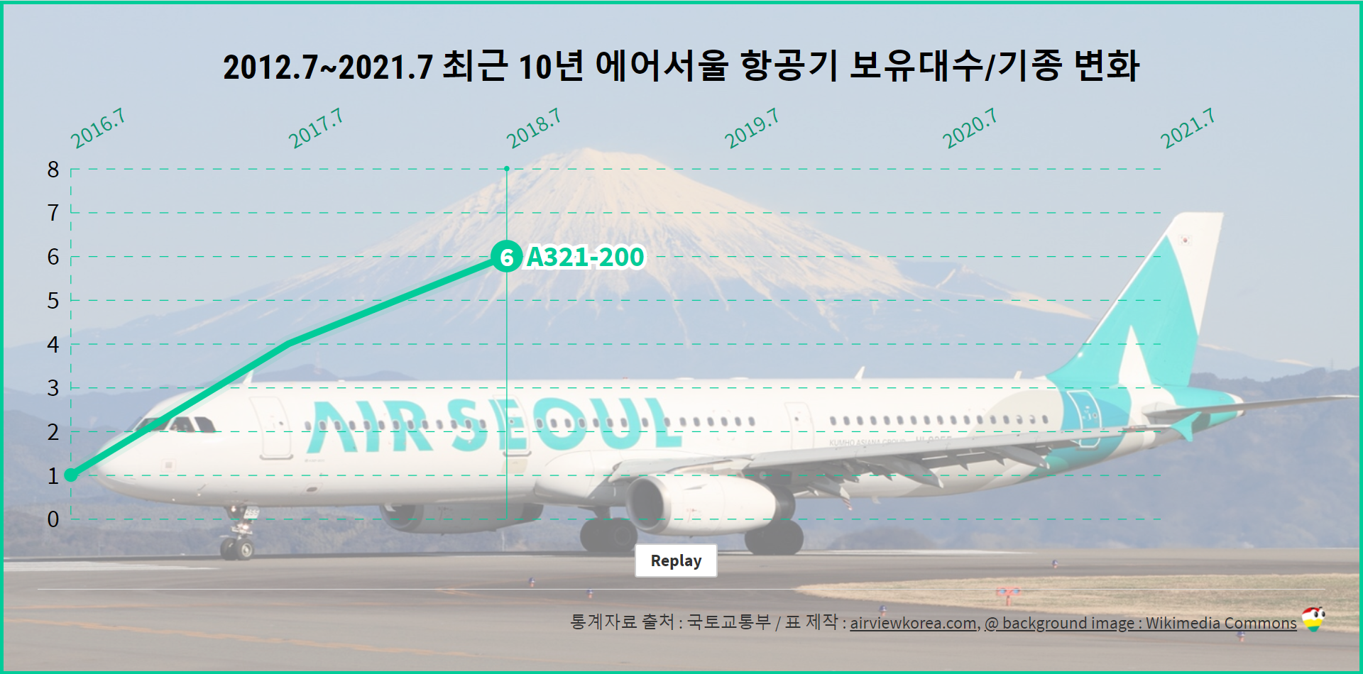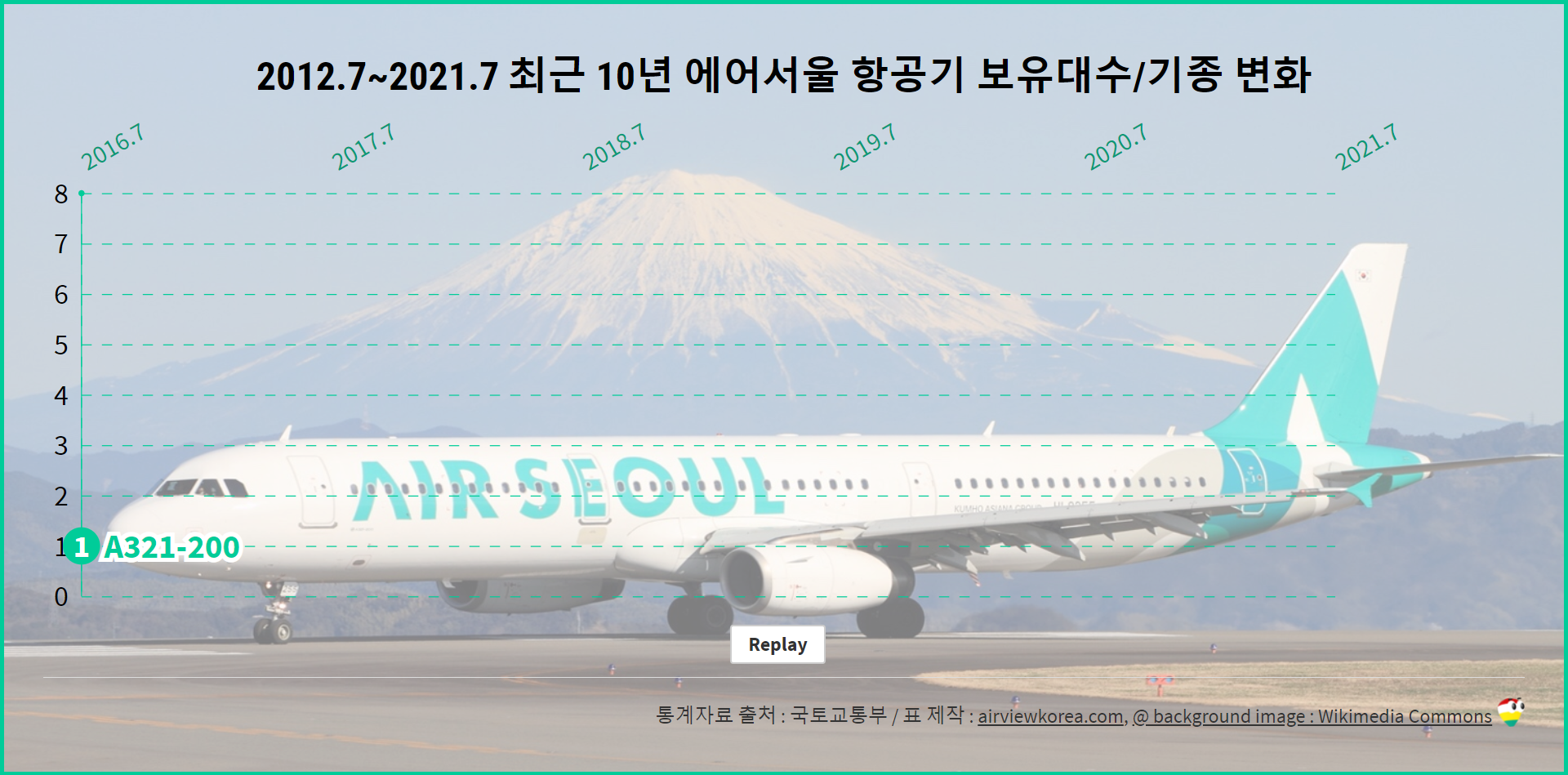 [2021년 7월 기준] 최근 5년 에어서울 비행기 종류 보유기종/보유대수 변화 (항공기 에어버스 A321-200)